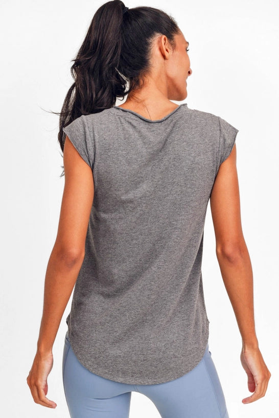 Your classic V-neck athleisurewear has upgraded to a whole new level. Features raw edges, stitching collar details, curved hemline and short cap sleeves that show off a V silhouette giving you that hourglass look. Style with a knot in the front for a more form fitting look or wear as-is for relaxed vibes. Either way you will be rocking style while working out, relaxing around the house or wherever your adventure takes you for the day in this tee.