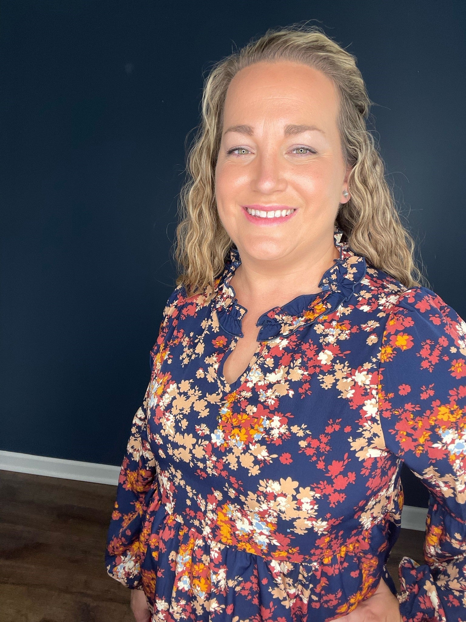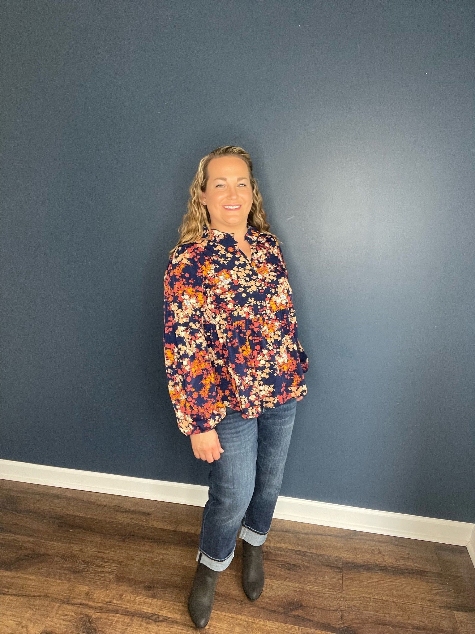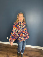 This is the perfect fall blouse for all. The floral pattern with ruffle details around the neck screams fall all day long. We love the loose fit and it provides a tiered ruffle on the bottom to keep it loose fitting. Available in S-3XL.