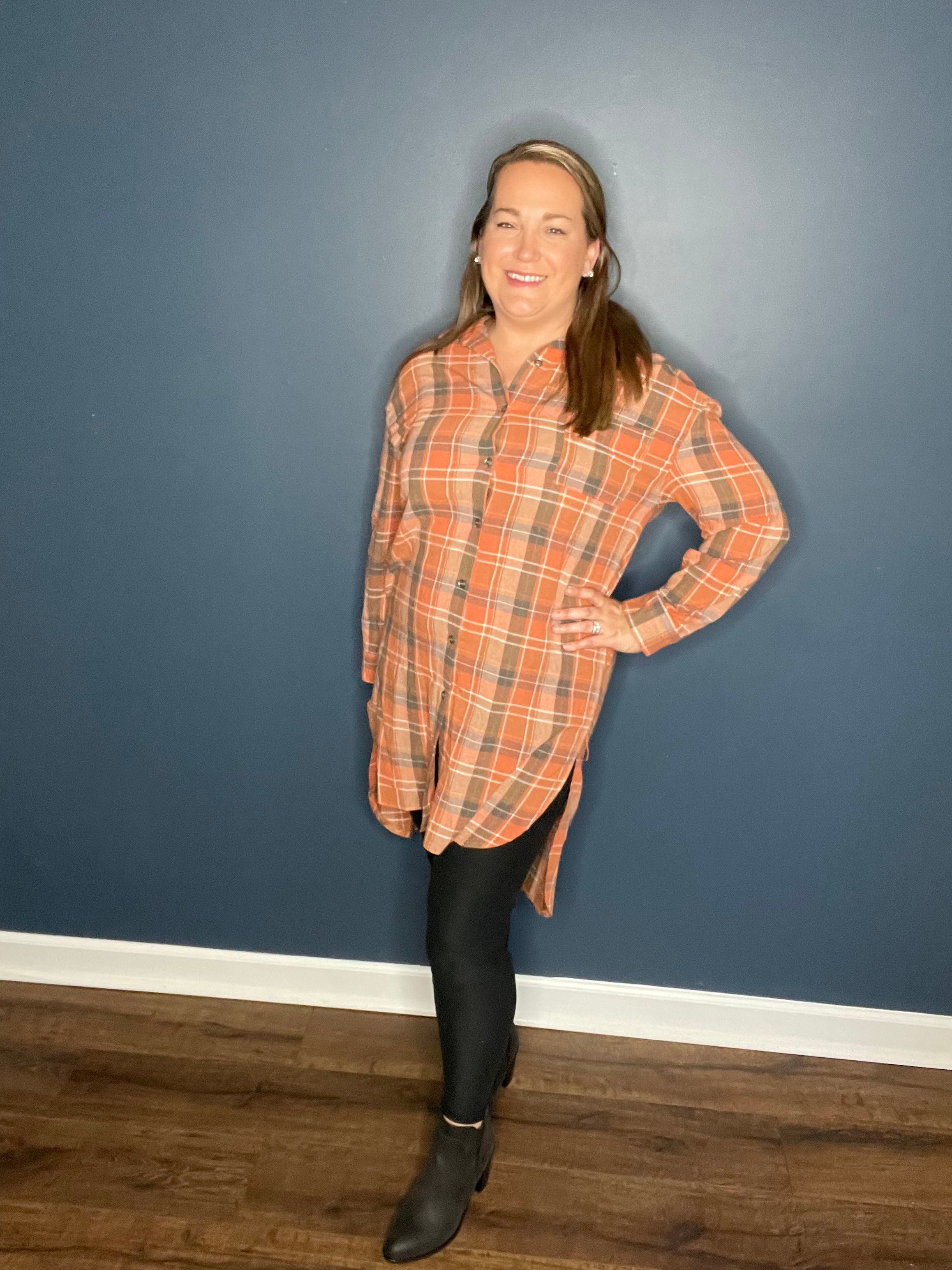 Happy Fall Y'all! This plaid button up tunic is on point for all fall activities. Pair it with some leggings and boots and you are ready for hay rides, pumpkin picking, corn maze and cool autumn air! Bowles Farm anyone?