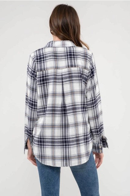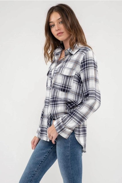 Your classic plaid shirt is here and perfect transition piece for the fall. This lightweight button-down shirt has the classic button cuff. Wear this top as-is or wear it as a layering piece over a top.