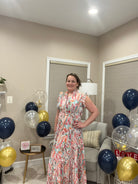 Hello Spring! Every spring color is captured beautifully in this maxi dress. Features ruffle sleeves, button up V-neck, and tiered layering with front tie. Flowy and fun this maxi dress is light weight and perfect for spring.