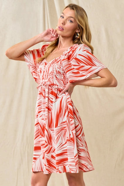 Smocked Bodice Floral Dress - Red