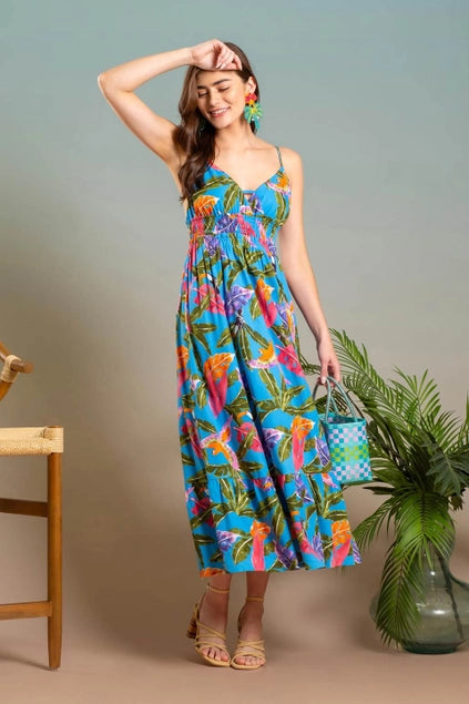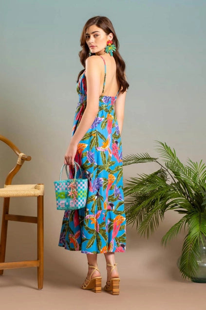 Get ready to show off your playful side with our Tropical Dress! With a deep sweetheart neckline and adjustable straps, this dress will be your go-to for any occasion. The elastic waistline and ruffle hem add a touch of comfort and style, while the vibrant tropical print will make you stand out in any crowd. Stay cool and confident with the added bonus of a lined interior. Time to let loose and have some fun in this dress!