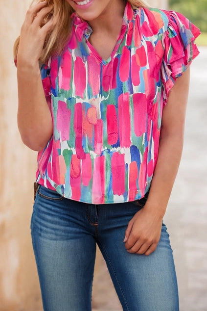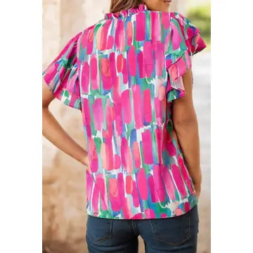 "Add a pop of color to your wardrobe with our Abstract Shirt! Featuring a bold watercolor pattern in pink, blue, and green, and playful ruffle sleeves, this bright and unique shirt is sure to turn heads. Perfect for any occasion, stand out in style with our Abstract Shirt.