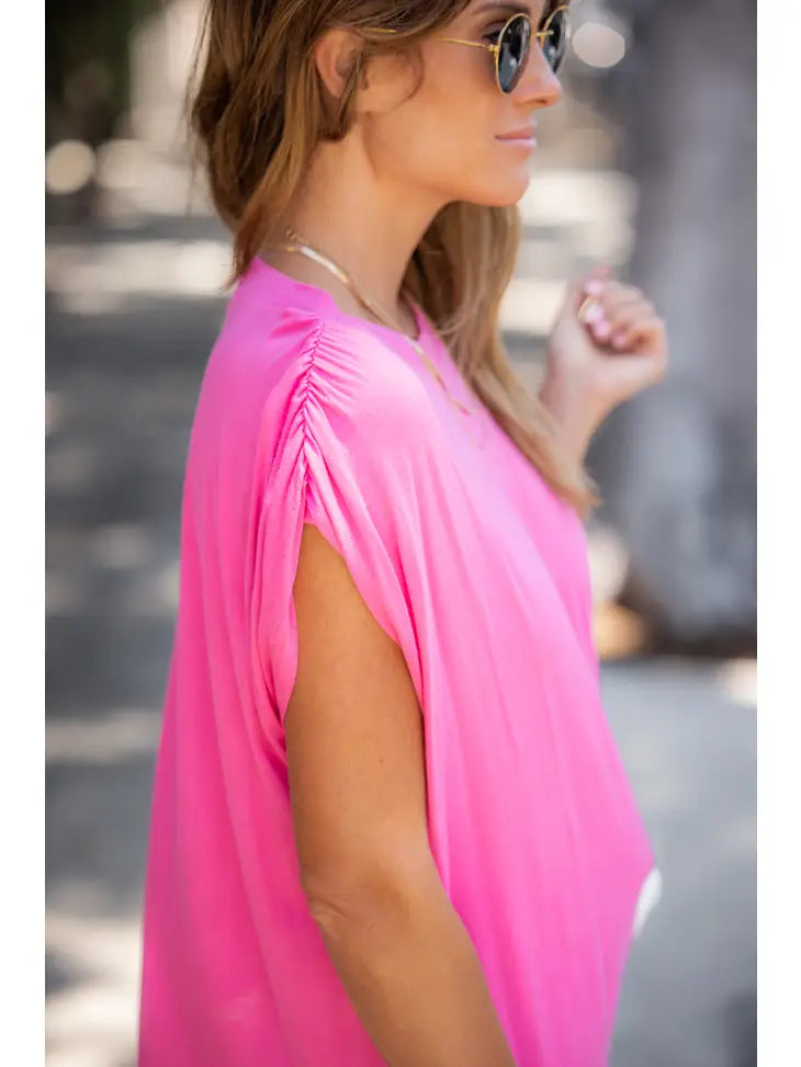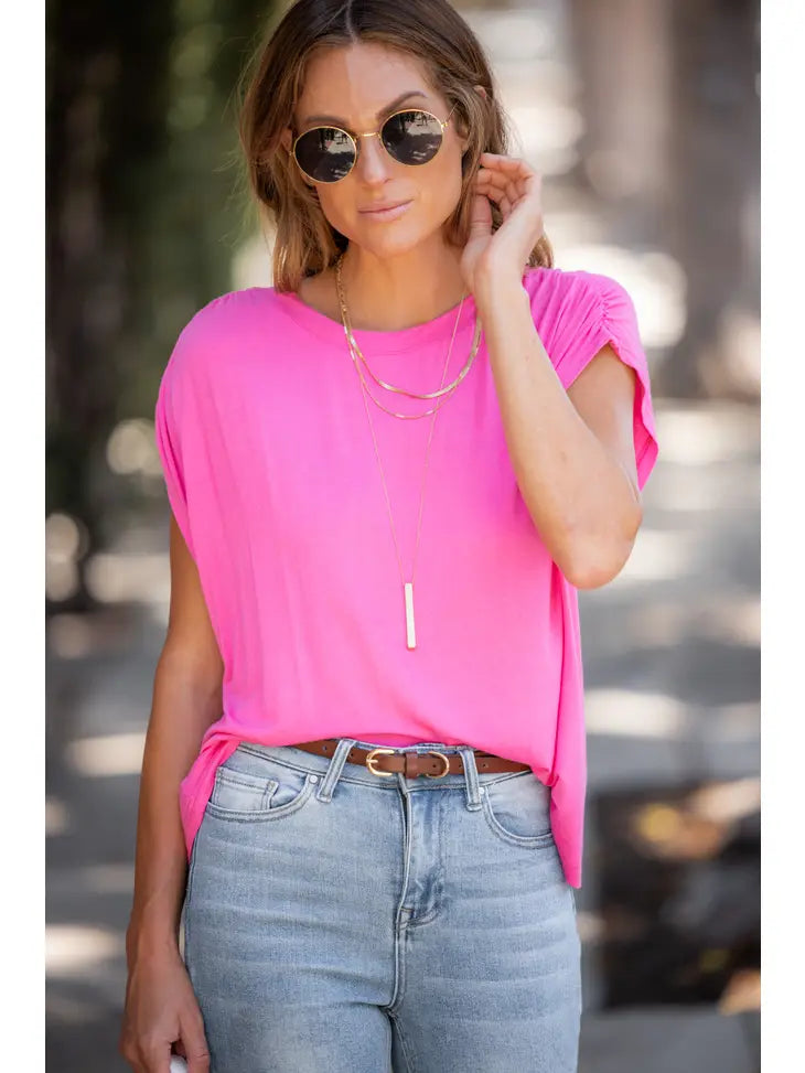 Super Soft Casual Ruched Shoulder Tee - Hot Pink