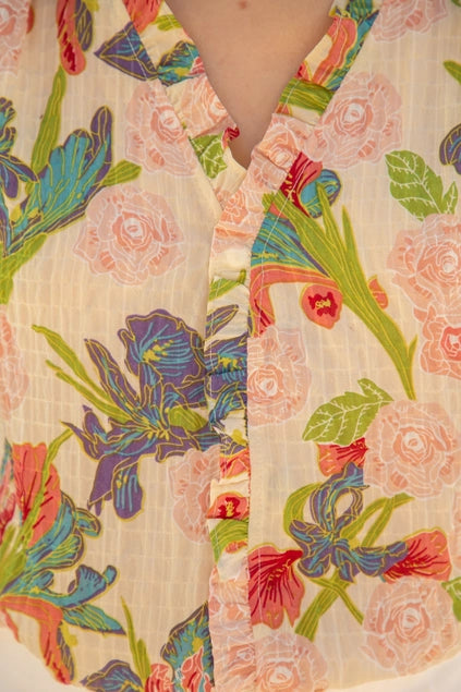 Indulge in the romantic and feminine feel of our Floral Flutter Sleeve Shirt. The delicate V-neck and ruffle detail add an elegant touch, while the textured fabric and short pleated sleeve provide comfort and style. The colorful and playful floral pattern is sure to make a statement. Perfect for any occasion, this shirt effortlessly combines beauty and comfort.