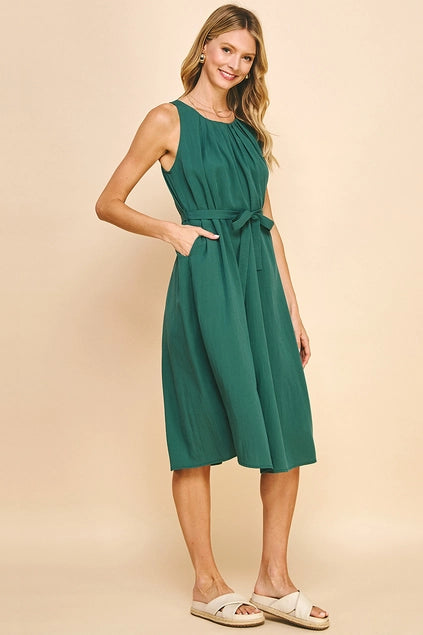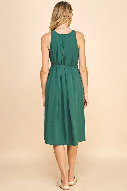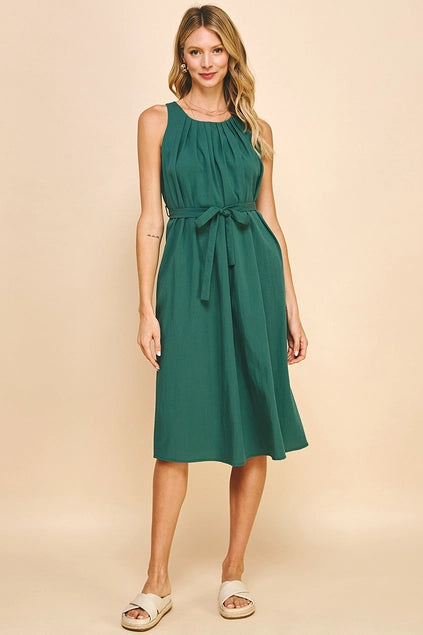 Ready for Spring? Jump start your spring wardrobe with this beautiful, pleated midi dress. Features a pleated neckline, functional belt and pockets. Pair with a blazer or cardigan for a formal event or pair with your favorite wedges and accessories for the perfect outfit for brunch.