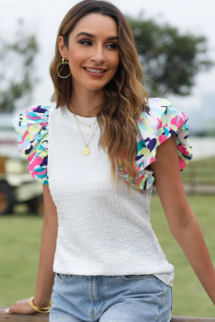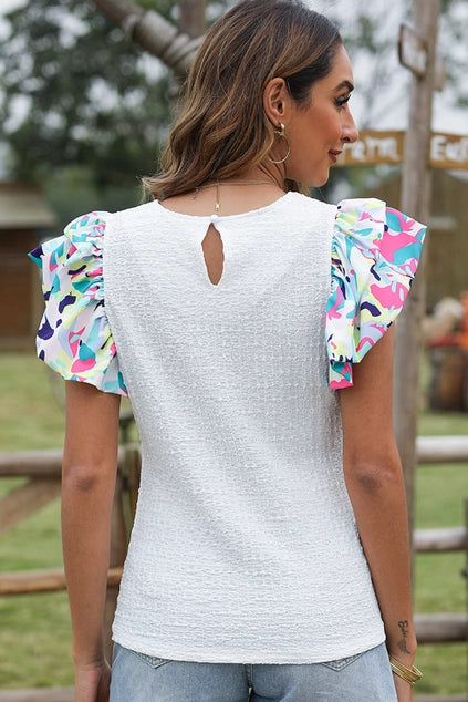 This textured blouse with ruffle puff sleeves effortlessly adds volume to your look. With its unique printed sleeves, it's an eye-catching addition to any outfit. A perfect blend of style and comfort, this top will make you stand out (in a good way!).