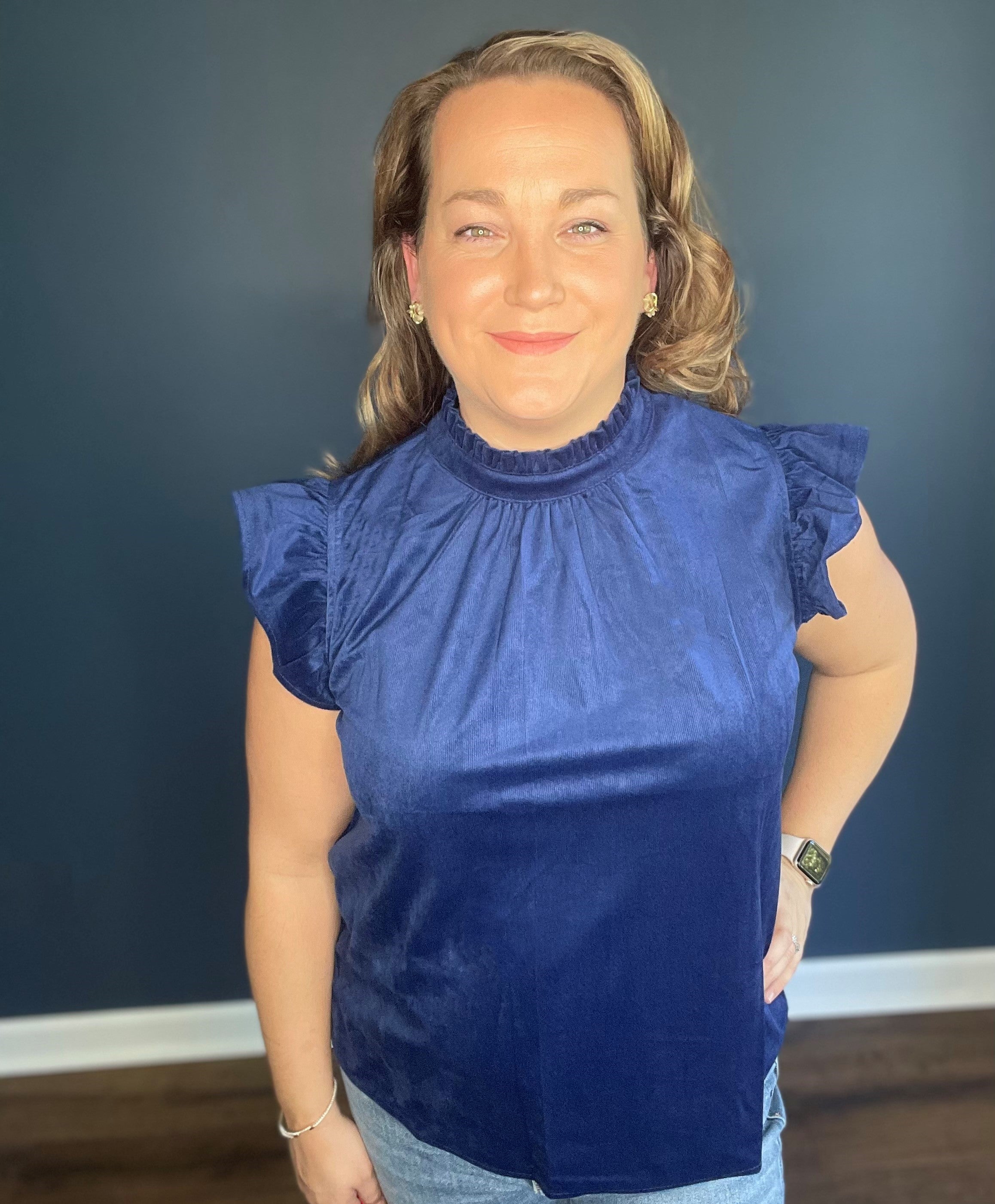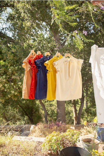 Our favorite suede shirt has arrived in a corduroy version! Features ruffle sleeves, high neck band, key-hole back with tie detail and the soft faux suede fabric makes this a top runner for our go-to shirt this fall.