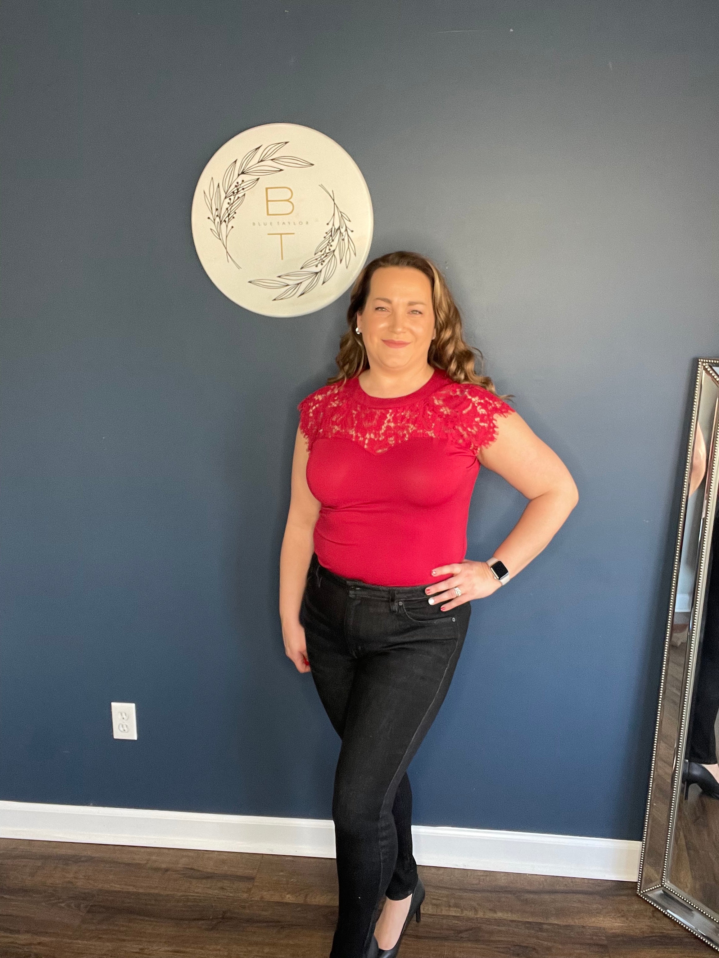 Ignite your wardrobe with our fiery red top, featuring exquisite lace detailing that adds a dash of romance to your look. This top is a true blend of sophistication and allure, perfect for making a statement wherever you go.