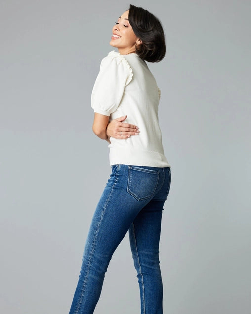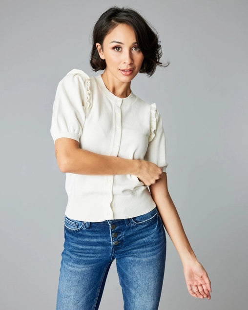 This short sleeve cardigan features delicate puff sleeves and elegant ruffle accents, adding a touch of femininity to any outfit. The button-up design allows for versatile styling options. This is a perfect timeless piece to add to your wardrobe.