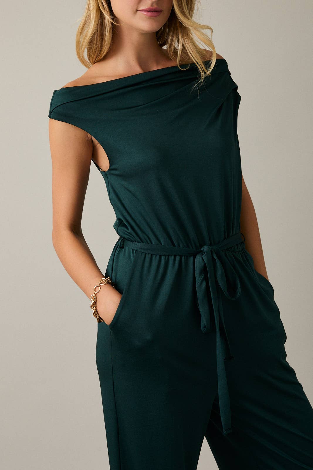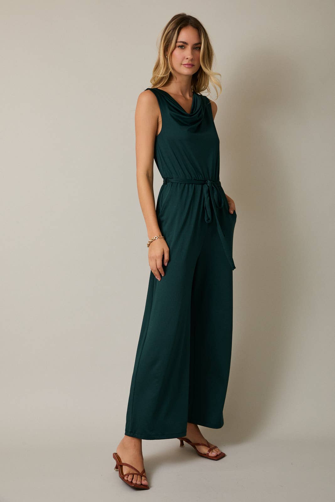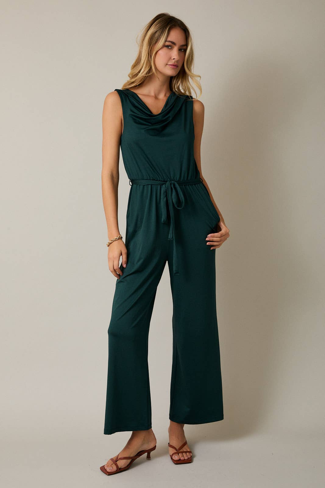 Make an entrance this season in The Emerald Eve Jumpsuit, a showstopping silhouette designed to flatter from every angle. Featuring a draped cowl neckline and waist tie detail, this sleeveless jumpsuit cinches and skims in all the right places for a sleek, elegant look.