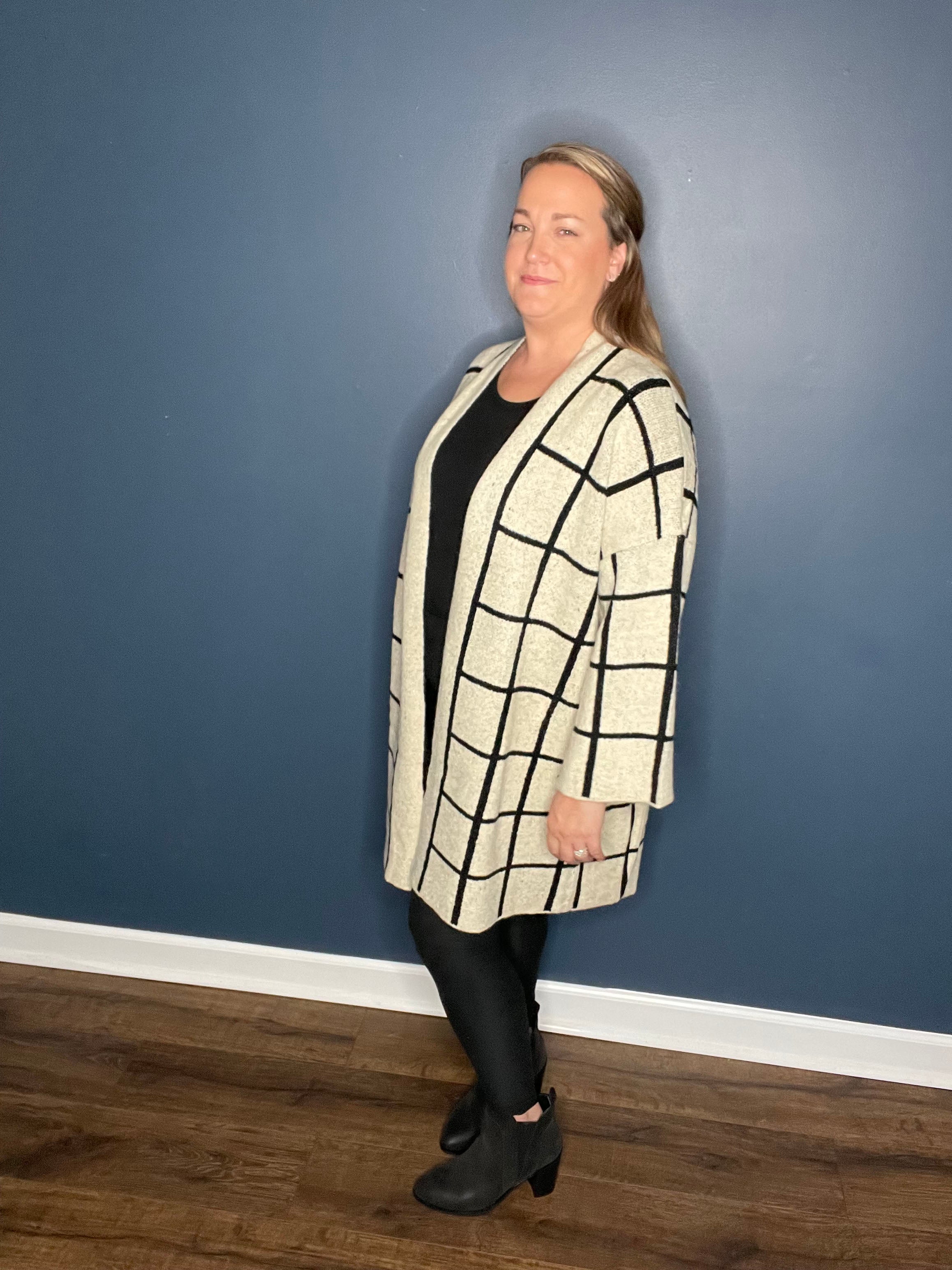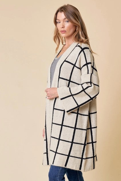 It's Sweater weather!  Spice up your wardrobe with this grid pattern long cardigan. It is fun, fabulous and super cozy!  This gem will keep you warm and stylish all season long.