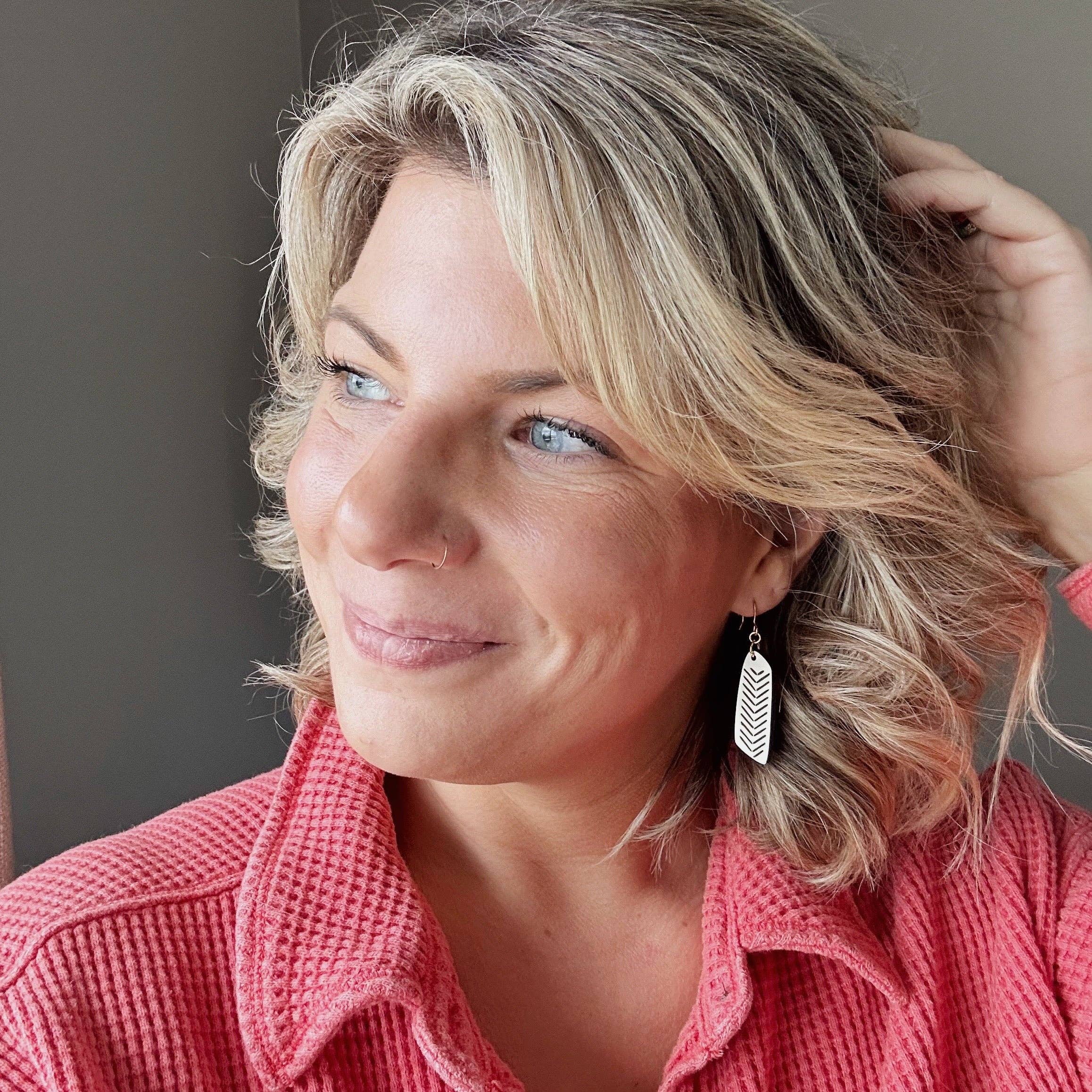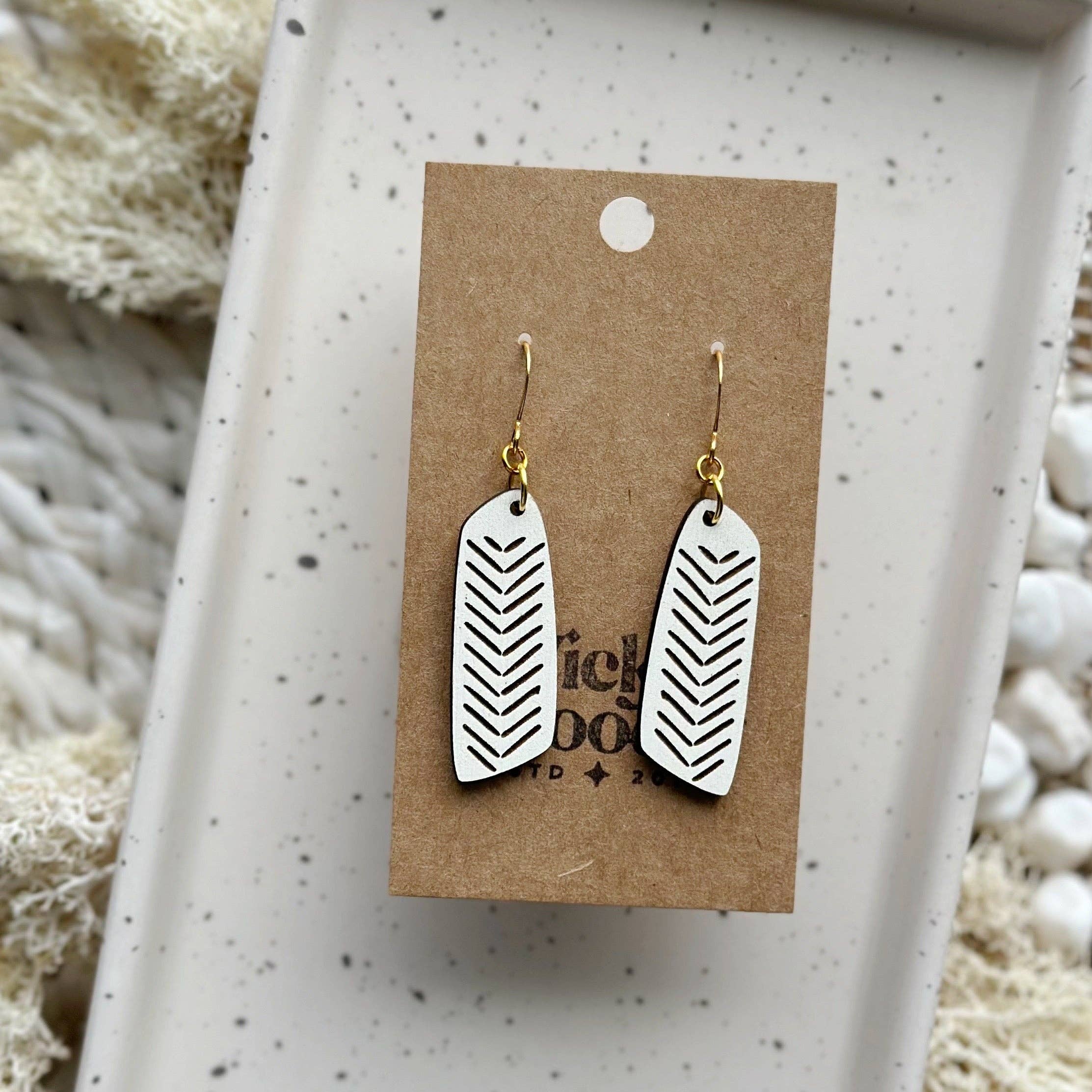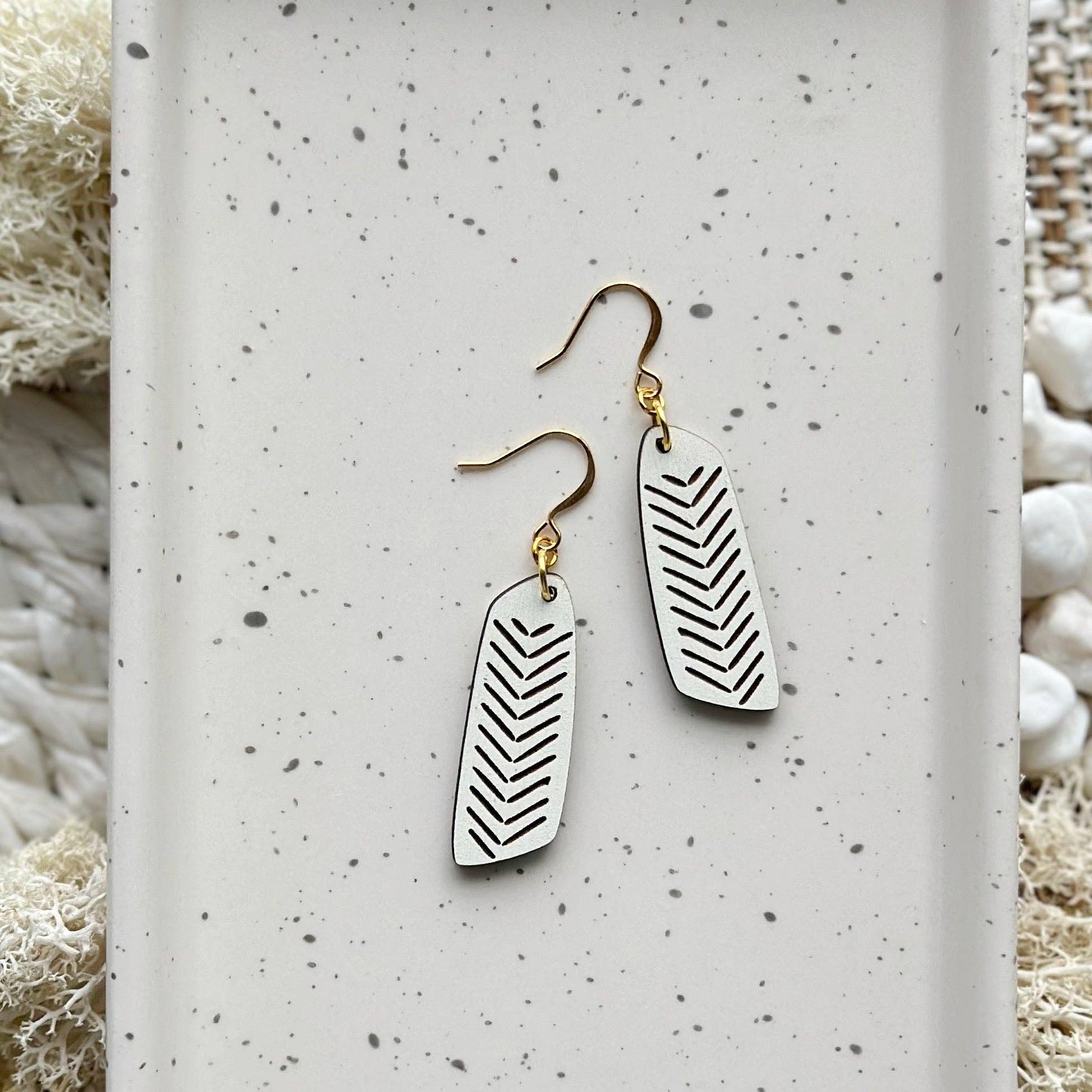 Add a bohemian flair to your wardrobe with these adorable Ebey Earrings! These playful engraved bar drops, measuring about 1.5" long, will jazz up any outfit. Crafted from hand-painted basswood with hypoallergenic gold-plated brass ear wires, they're the perfect mix of fun and style.