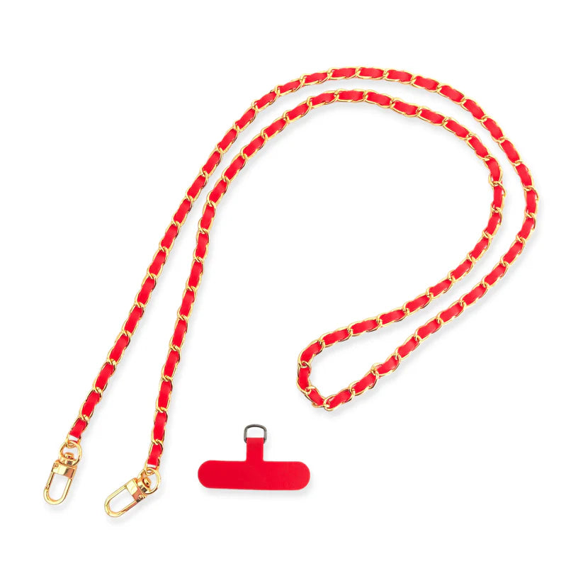 A stylish and lightweight plated aluminum curb chain cellphone strap with interwoven vegan leather secured by two clasps. The chain is long enough to use as a phone chain or purse chain for a fashionable and sophisticated look.