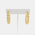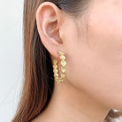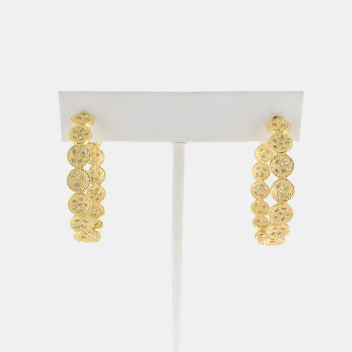 Our beautiful textured circle pattern hoop earrings have embedded bling in half the hoop for a little extra shine. Made of 18k gold and rhodium plated with cubic zirconia in the hoop, these are the perfect accessory to complete your outfit. These will not disappoint and are limited edition, grab them before they are gone.