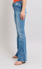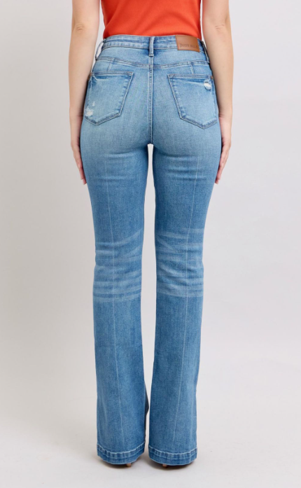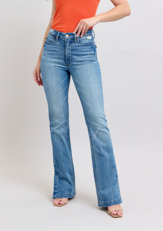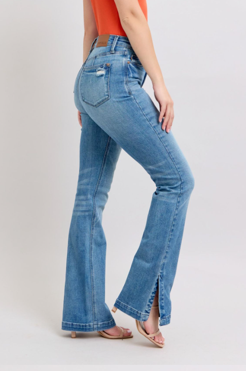 Get ready to rock your curves with Judy Blue Vintage Wash Sim Boot! These high waist jeans provide tummy control for a flattering fit. With a stylish side slit and trendy boot cut, you'll be turning heads. Plus, a touch of distress adds edge to your wardrobe. Perfect for any fashion-forward babe!