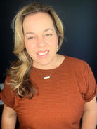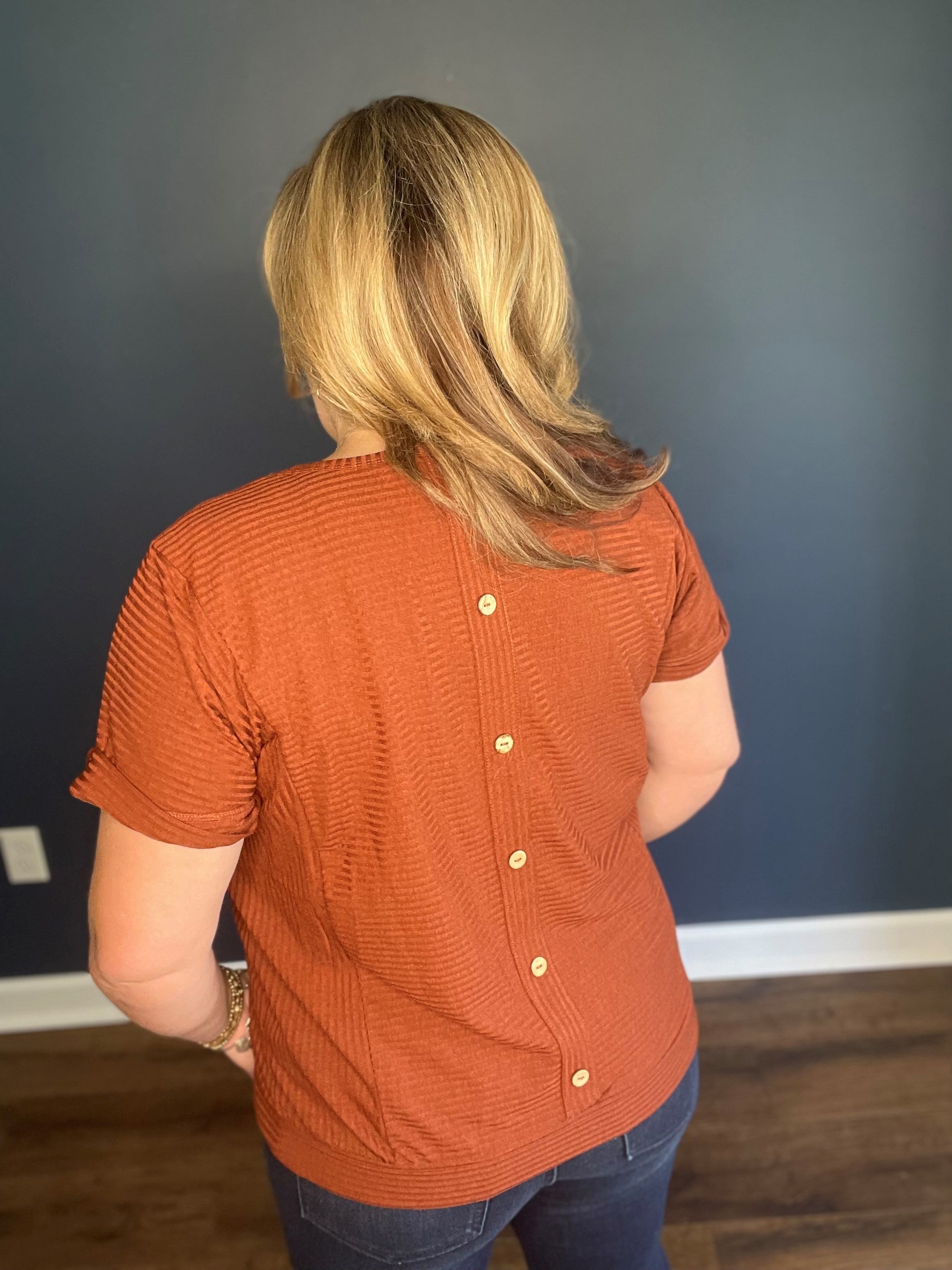 This ribbed shirt features cuffed sleeves and non-functioning buttons down the middle of the back for added detail. Great transitional piece for fall.