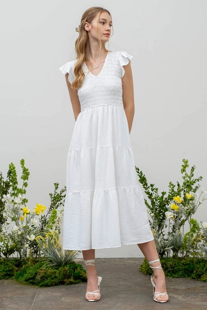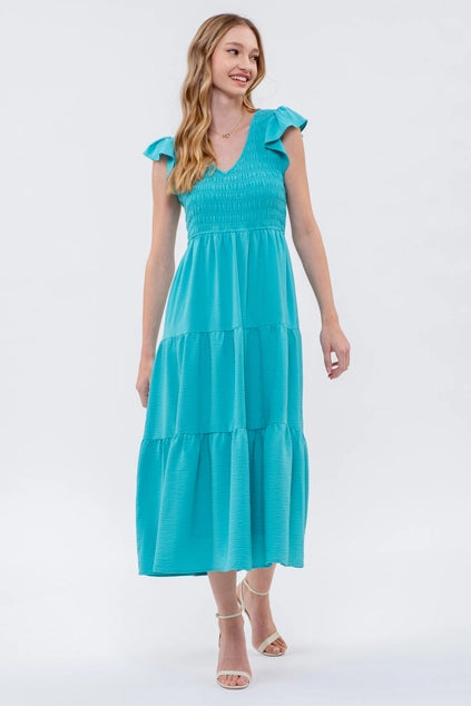 A fun, flowy maxi dress has arrived. Features flutter sleeves, V-neckline and stretchy top keeps you comfortable. The tiered layering keeps this dress fun and flowy and is perfect for spring/summer wardrobe collection.