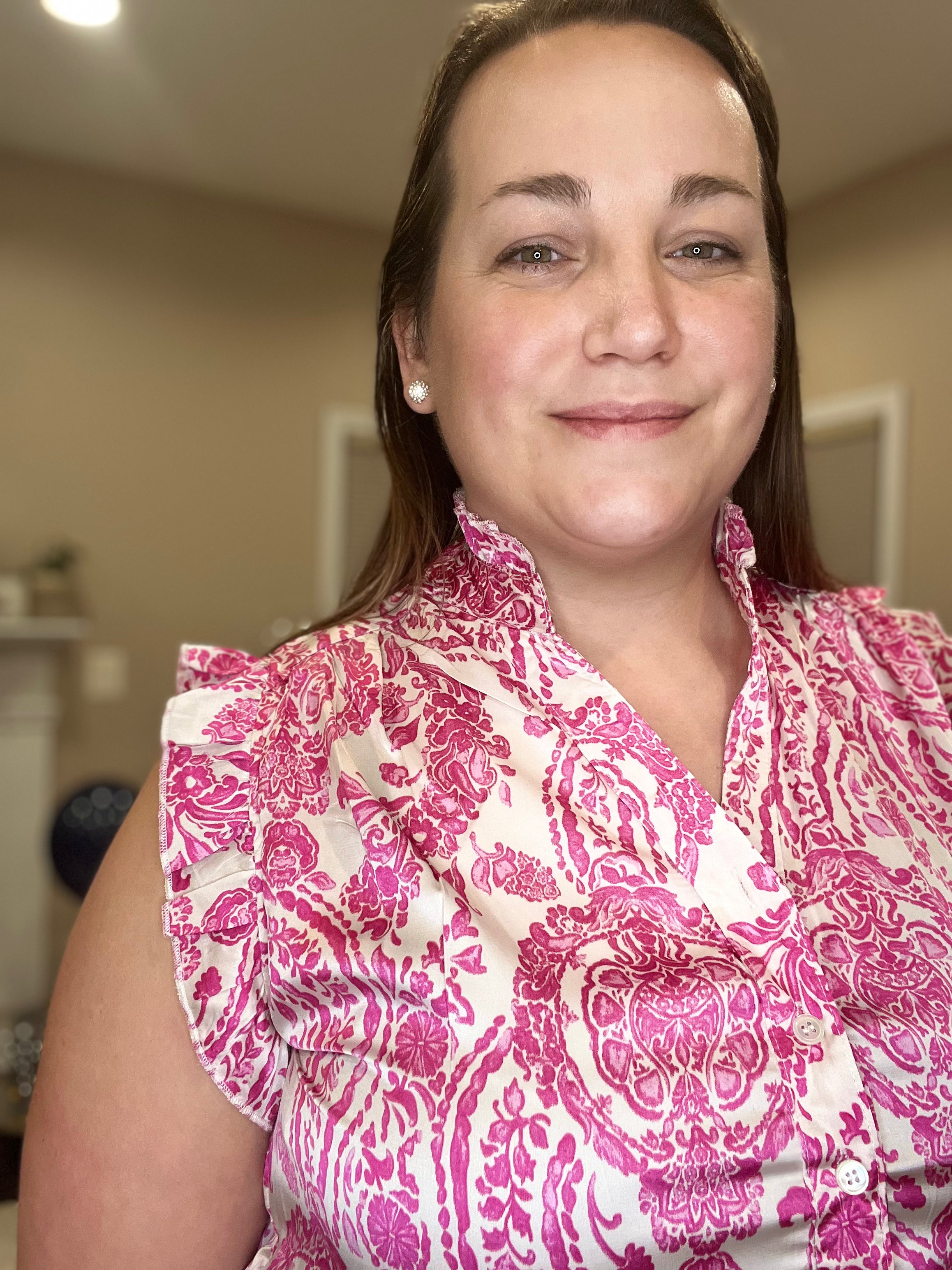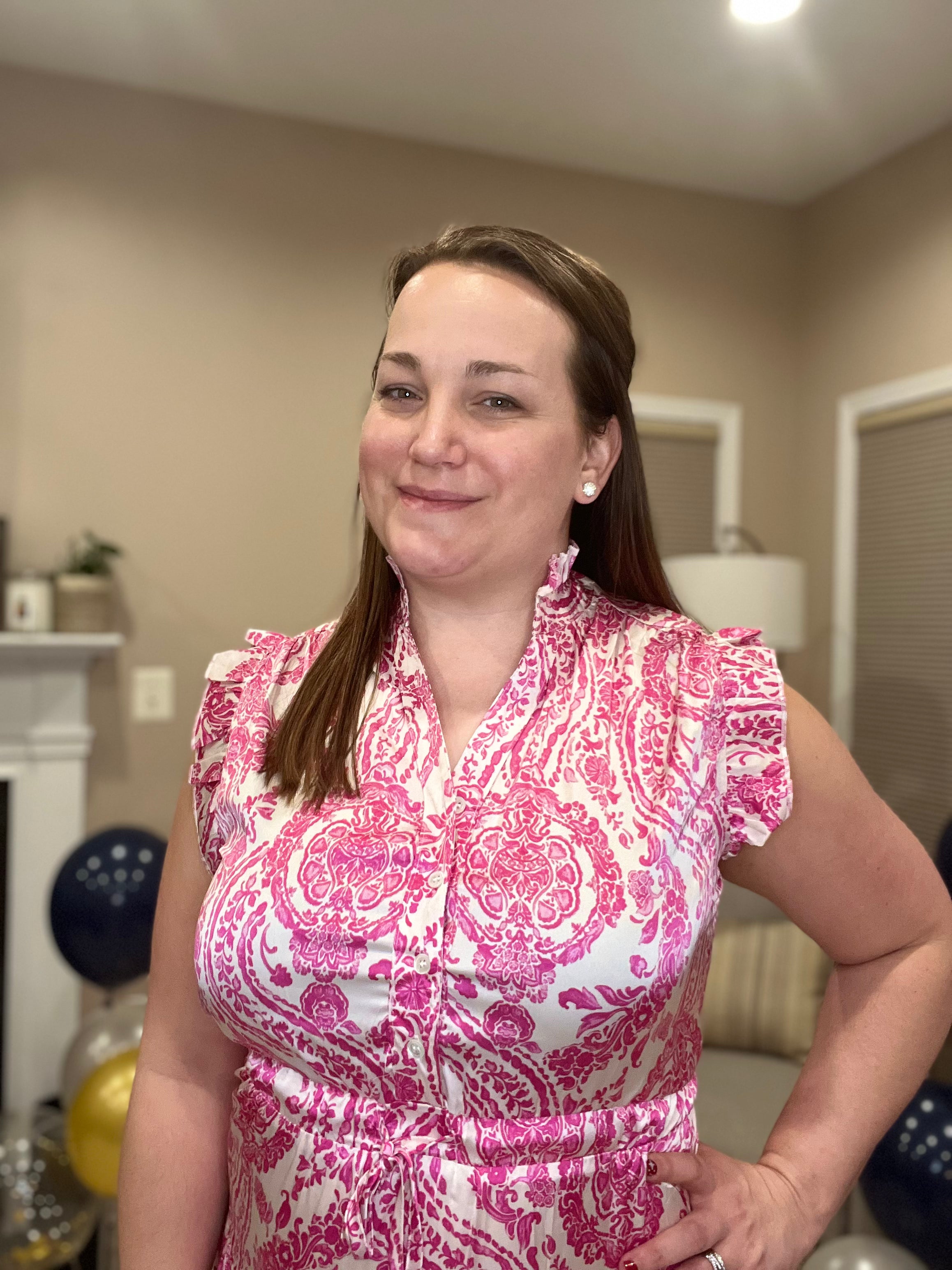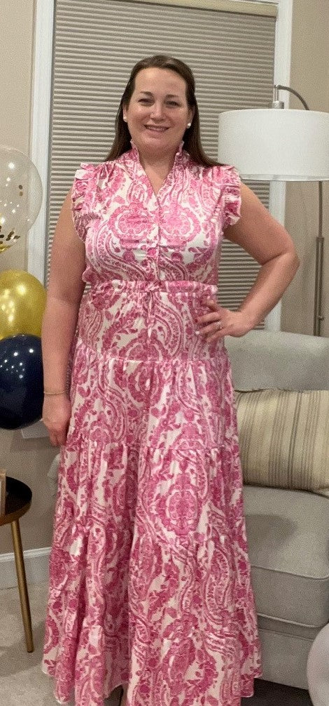 Pretty in pink! This tiered maxi dress is beautiful and will have you feeling stunning. Features paisley design, ruffle sleeves, button down V-neck, ties at the waist and is a satin feel. Flowy and elegant you will be ready for spring events in this dress.