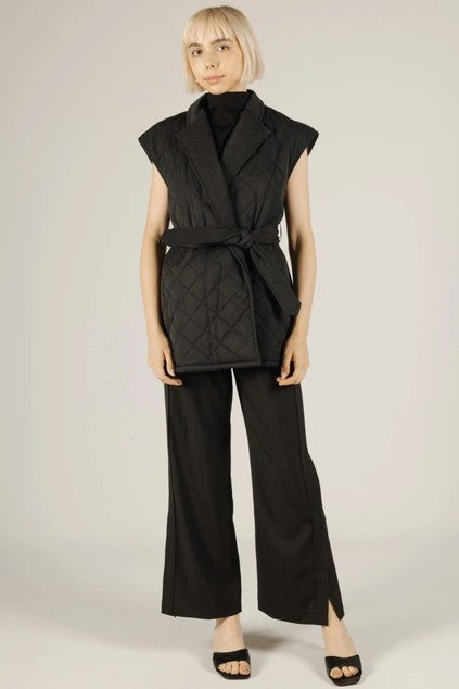 Looking for the perfect vest to dress up or down? This quilted wrap vest is a must have piece to add to your wardrobe. The quilted detail is on-point and the removable wrap belt is a great accent for style and function.