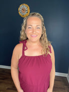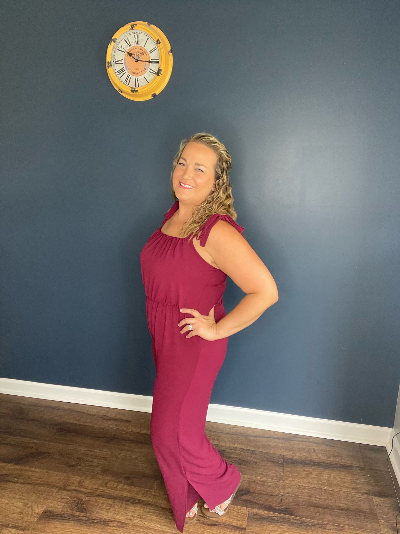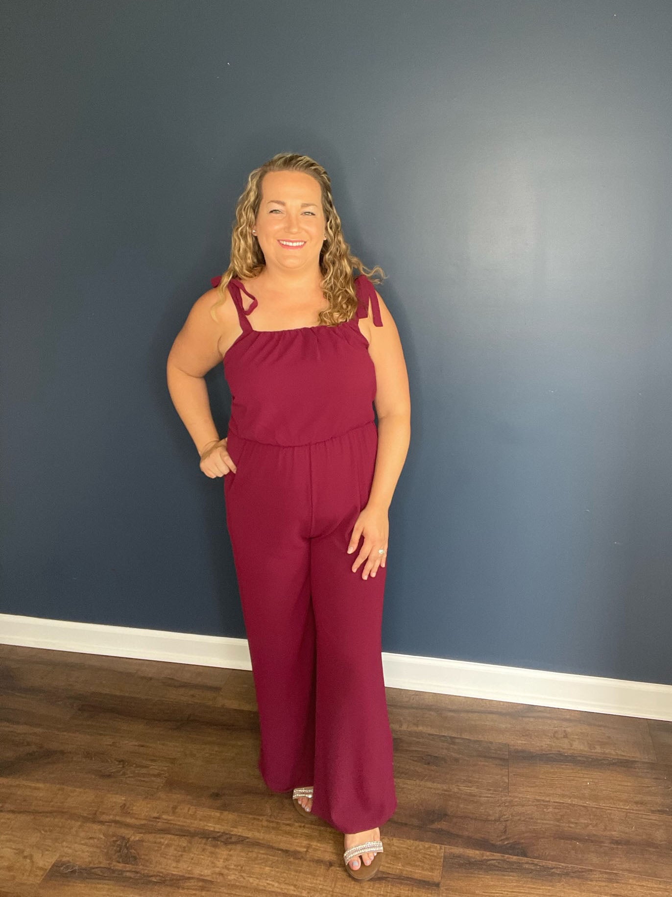 Ready for holiday fun? This dressy and elegant jumpsuit will be a figure flattering hit for any event. Fun and flirty ties on the shoulders, rouching detail at the waist, and flowing side slits at the bottom. You'll be dancing the night away in this ultimate show stopper!