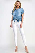 Your perfect summer short sleeve shirt has arrived. Button up with rolled sleeves in a light denim washed color is best for summer days. Wear it untucked for a relaxed fit or tie at the bottom for a short, fitted summer vibe.