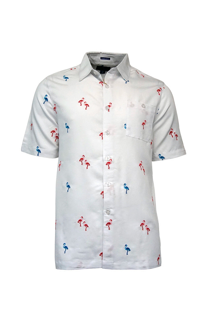 Strut your stuff in our vibrant Mingo Shirt! This eye-catching men's polo features a festive red and blue flamingo print that's perfect for your 4th of July celebrations. With convenient button-up styling, this playful shirt lets you show your patriotic spirit while keeping your summer look fun and fresh. Be the life of the barbecue!