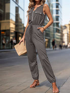 This sleeveless jumpsuit combines style and comfort with its zip-up front and chest flap pockets for a chic utility look. The elastic waistband with drawstring shapes your waist while breathable, stretchy fabric ensures ease of movement. Featuring jogger legs, it's perfect for all-day wear—from casual outings to brunch dates. Easily dress it up with heels or go relaxed with sneakers.