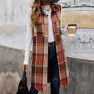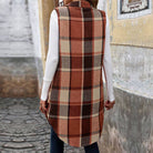 Elevate your wardrobe with the Pumpkin Spice Vest, featuring a stylish placket design and classic checkered plaid pattern. This sleeveless vintage-inspired knit vest combines a handsome blazer-style notched lapel, convenient pockets, and a zipper front for easy layering. Its warm, comfortable fabric and mid-length cut with a classic back slit make it a versatile addition, perfect for pairing with sweater dresses, t-shirts, or jeans to create a modern, polished look any season.