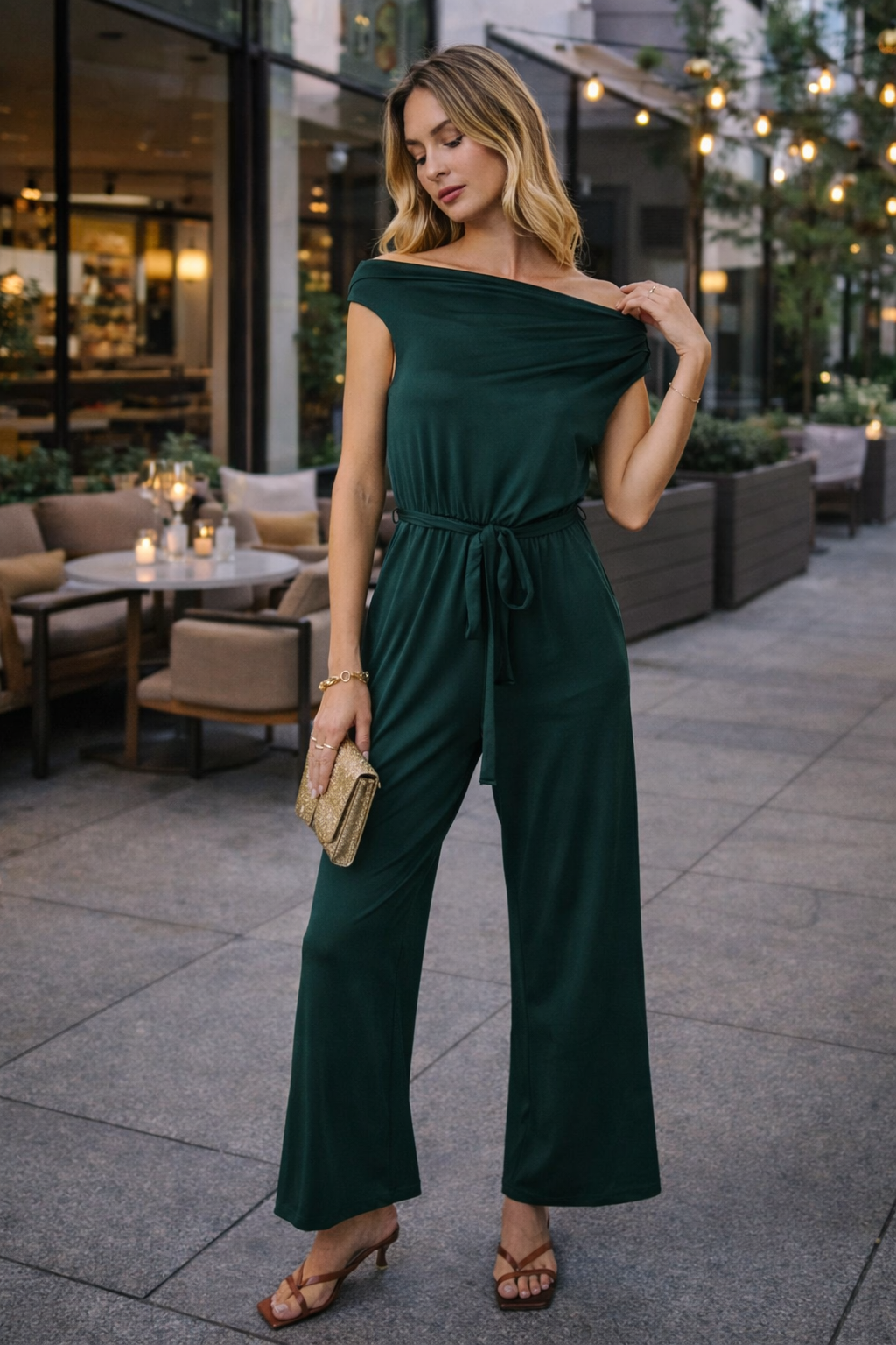 Make an entrance this season in The Emerald Eve Jumpsuit, a showstopping silhouette designed to flatter from every angle. Featuring a draped cowl neckline and waist tie detail, this sleeveless jumpsuit cinches and skims in all the right places for a sleek, elegant look.