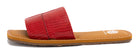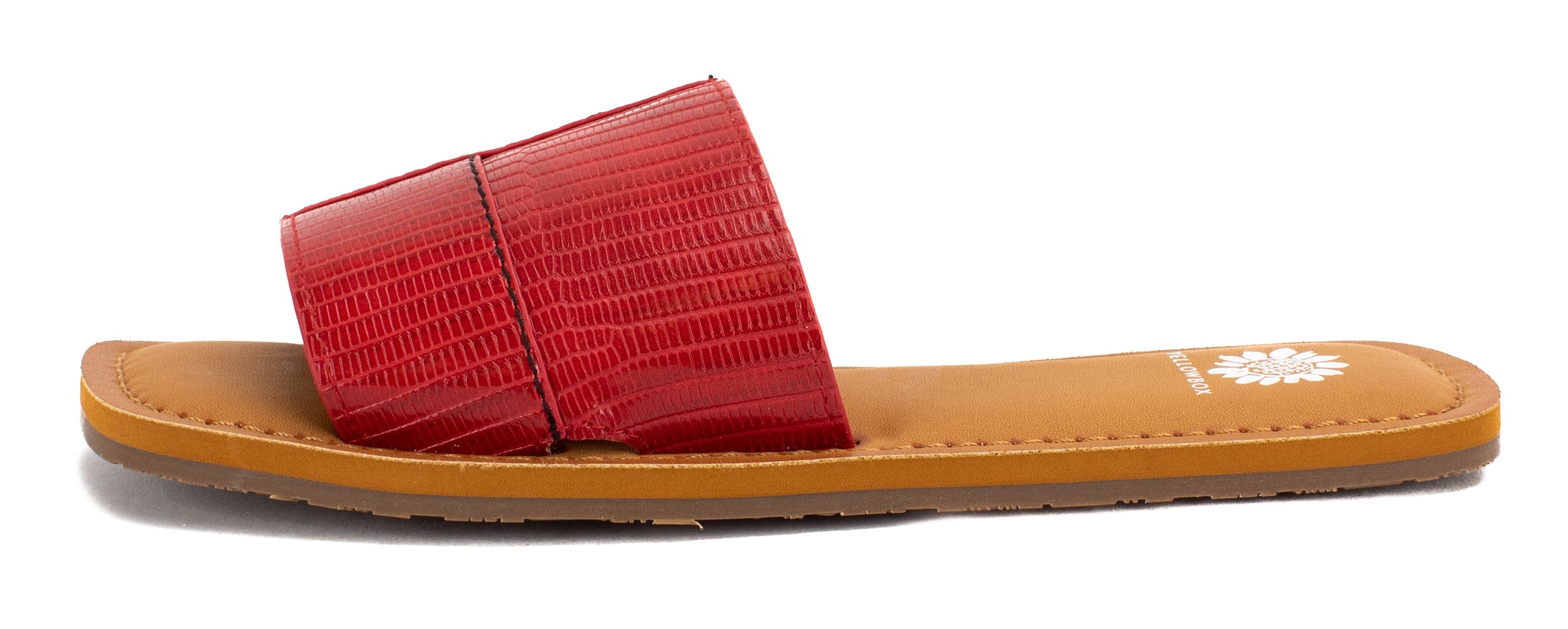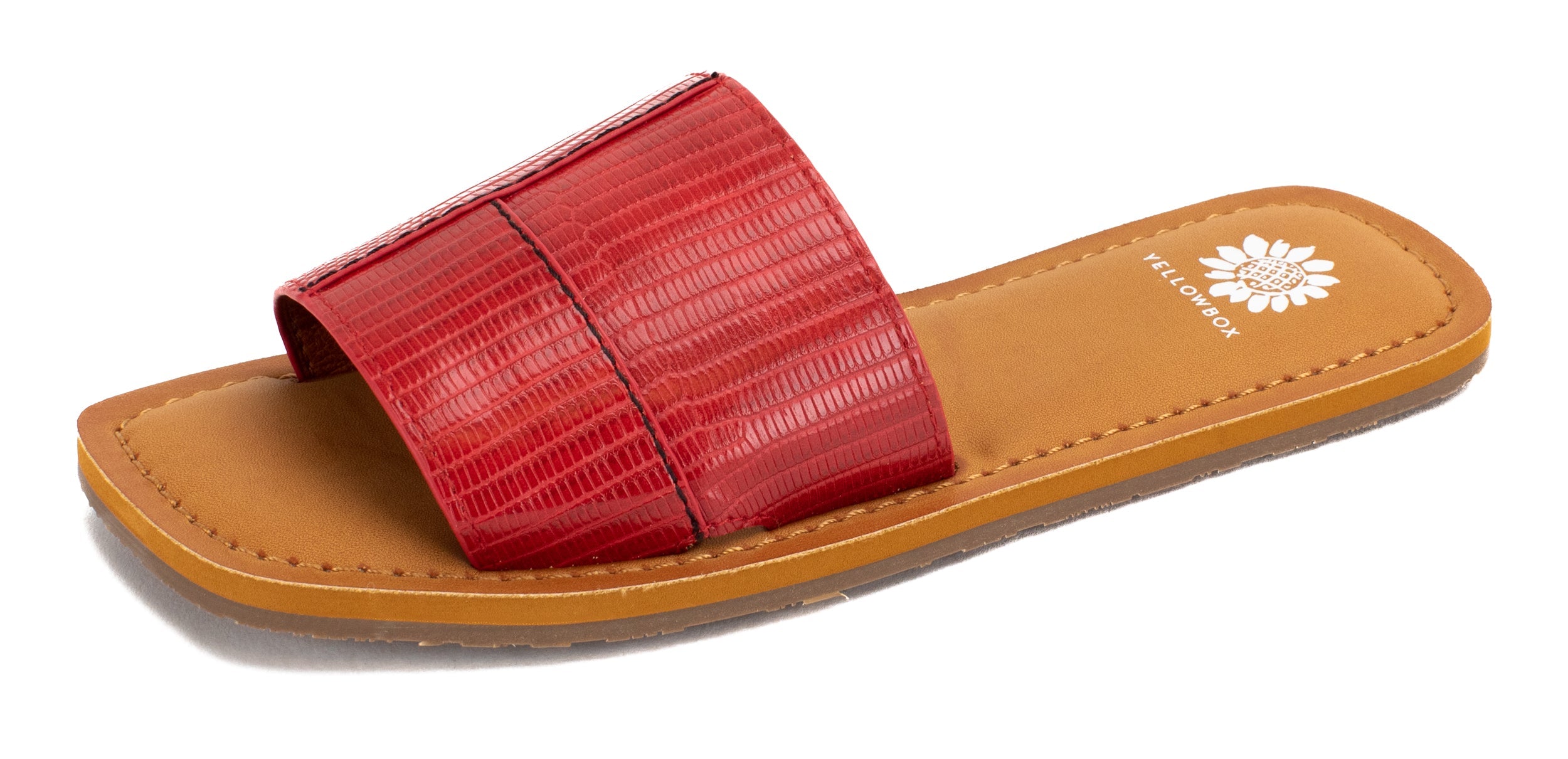 Modern chic flat slide featuring multi-textured faux leather patchwork and a square toe shape.