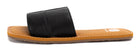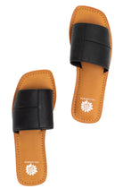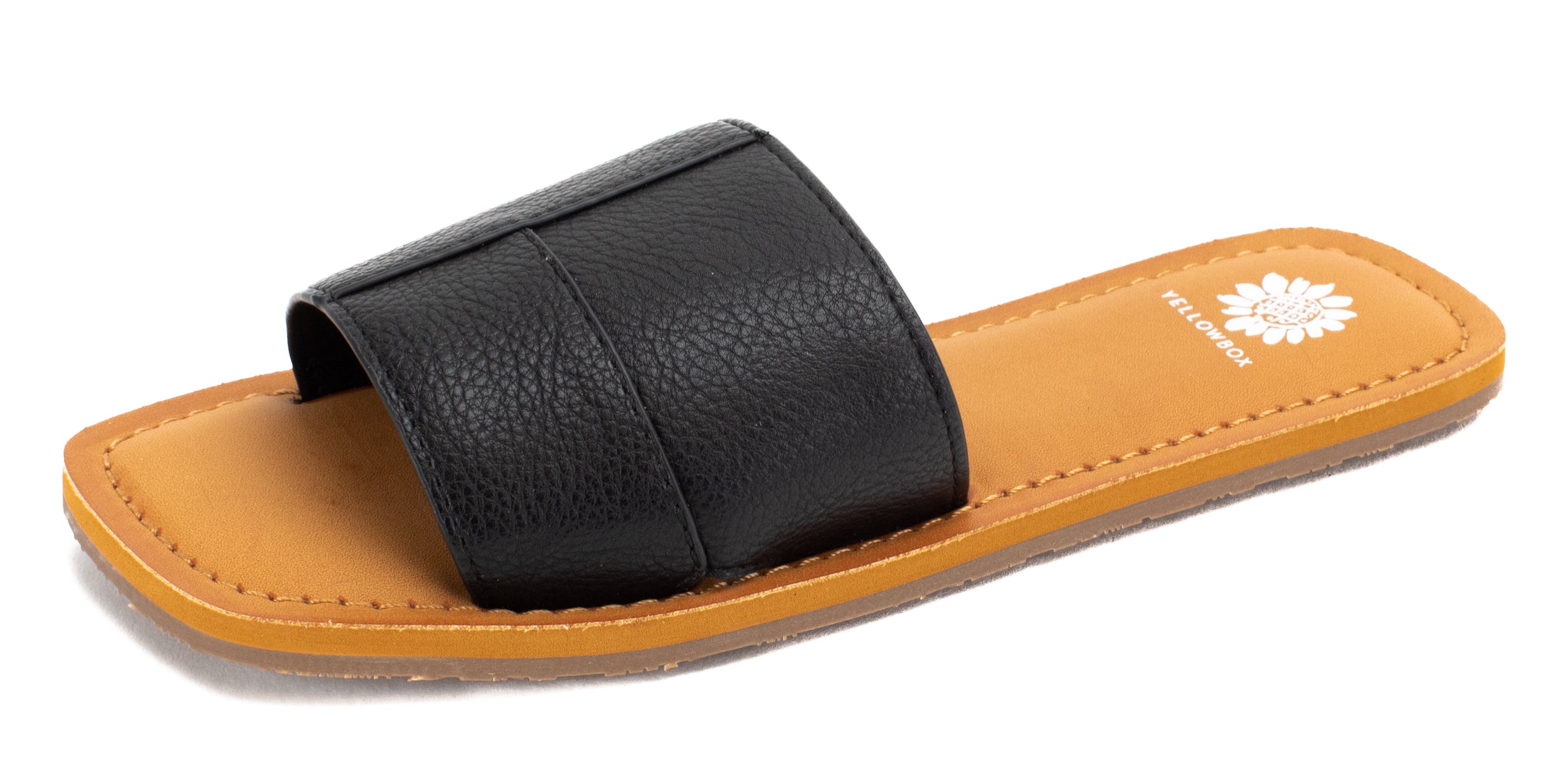 Modern chic flat slide featuring multi-textured faux leather patchwork and a square toe shape.
