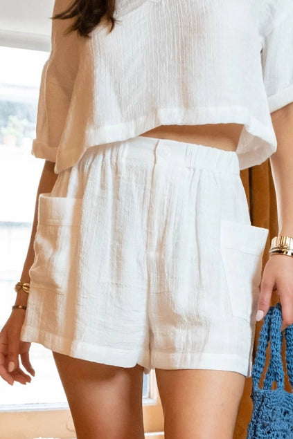 Indulge in ultimate comfort and style with our Woven Shorts. Crafted from a luxurious crinkle knit fabric, these shorts are both light weight and lined for added elegance. The elastic waistband and side pockets offer convenience without compromising sophistication. Upgrade your wardrobe with these must-have shorts.