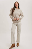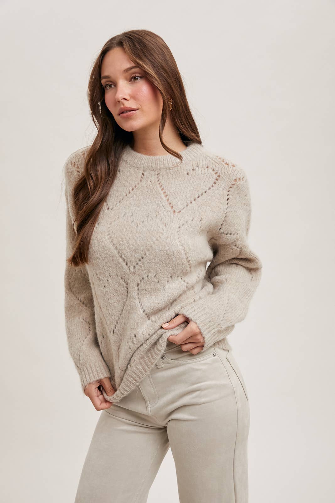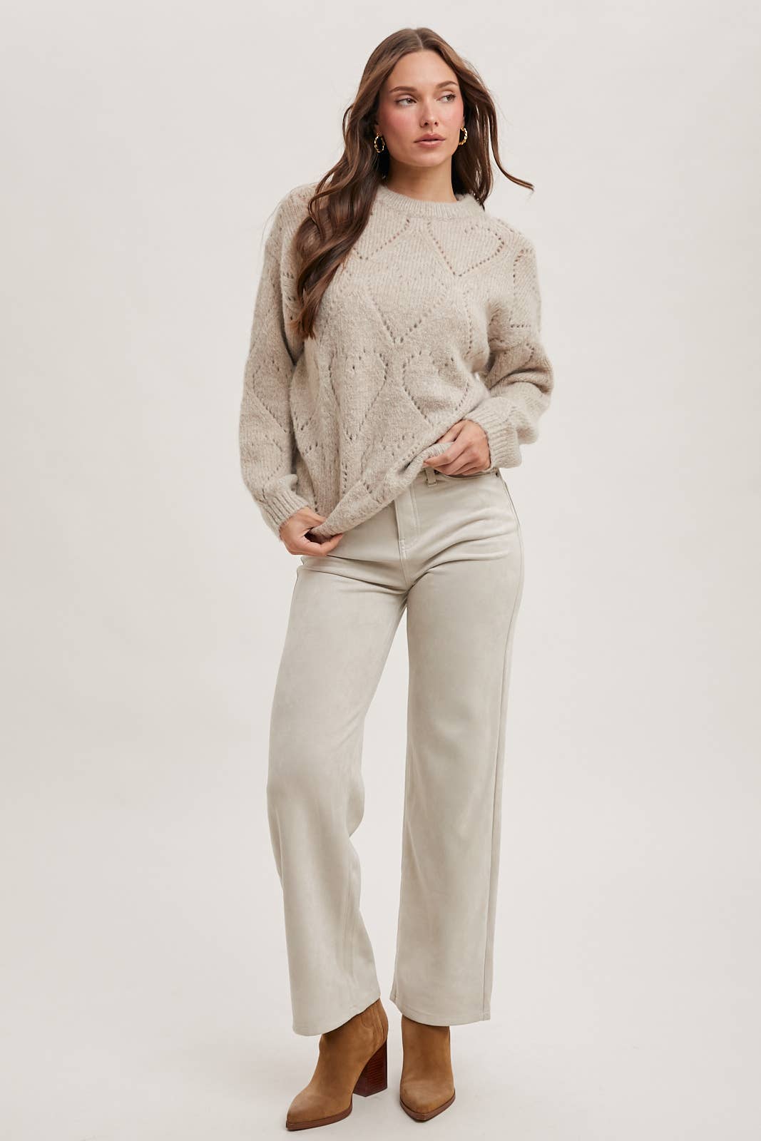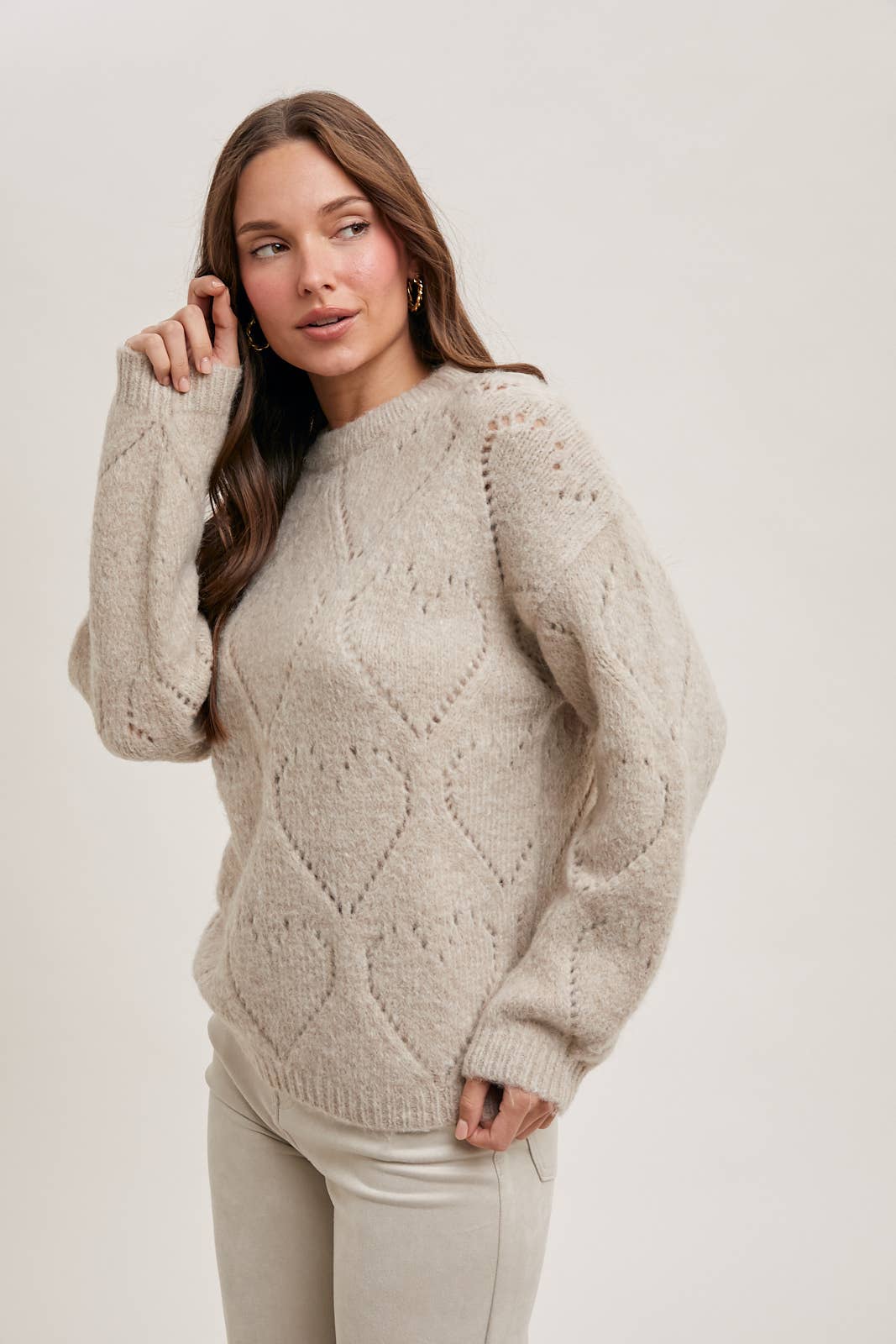Enhance your wardrobe with our luxurious crew neck heart knit sweater. This charming and cozy piece will add a touch of playfulness to any outfit. The classic crew neckline and heart-shaped knit patterns give it a whimsical and sweet appeal. Crafted from soft and comfortable knit fabric, it's perfect for cooler days, providing both warmth and style. The heart motif adds a trendy element, making it a versatile choice for casual wear. Pair it with jeans or skirts for a cozy yet fashionable look.