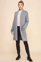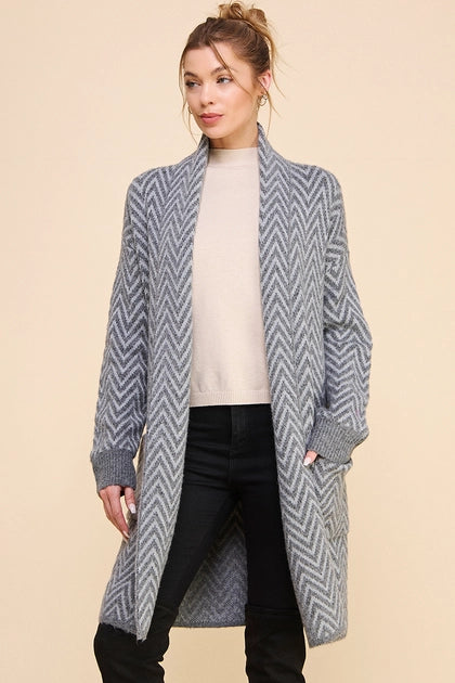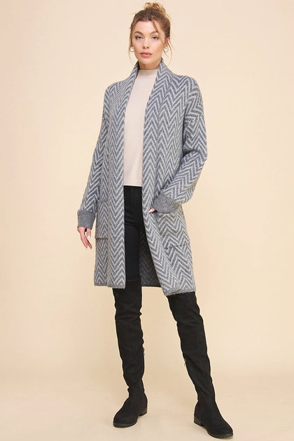 Indulge in ultimate comfort and style with our Heathered Chevron Shawl Cardigan. This cozy and long cardigan features a unique chevron pattern, perfect for adding a touch of sophistication to any outfit. And with functioning pockets, you'll have both fashion and functionality at your fingertips. Experience luxury like no other.