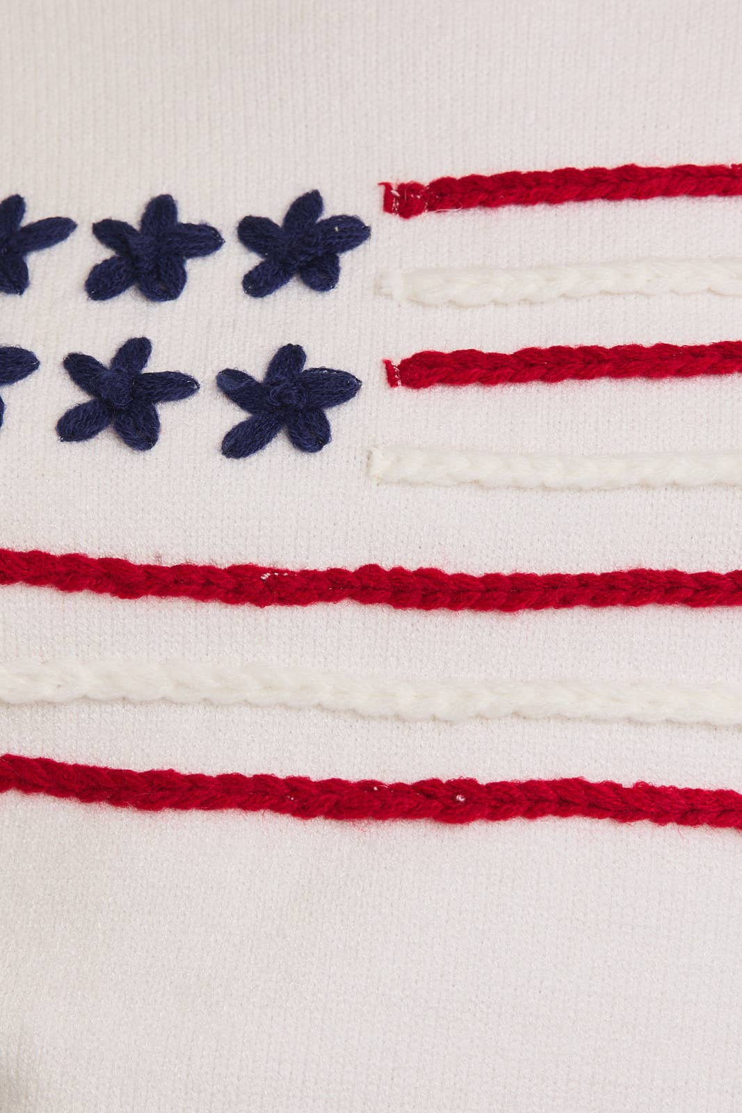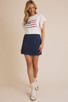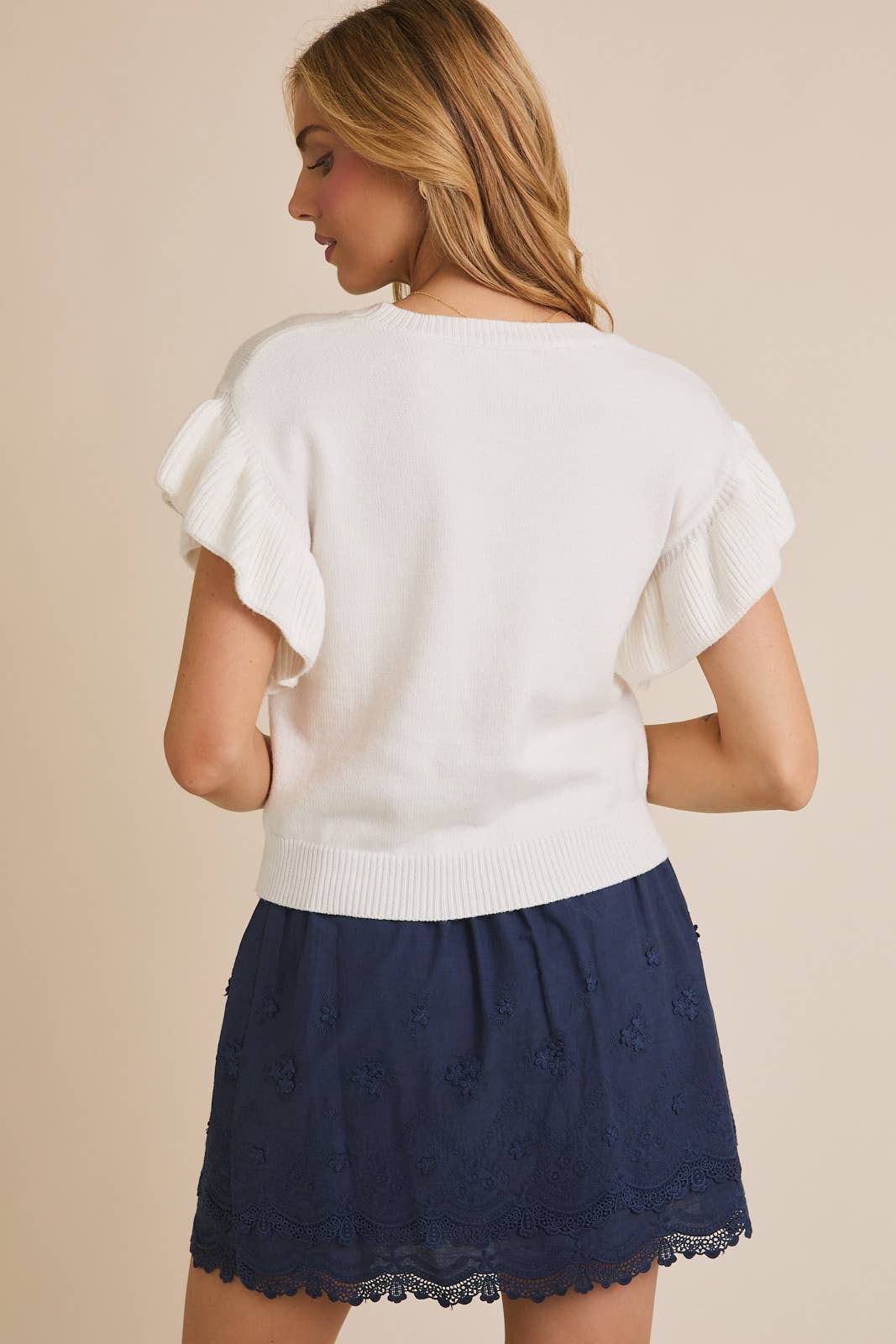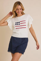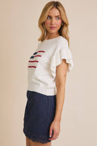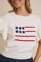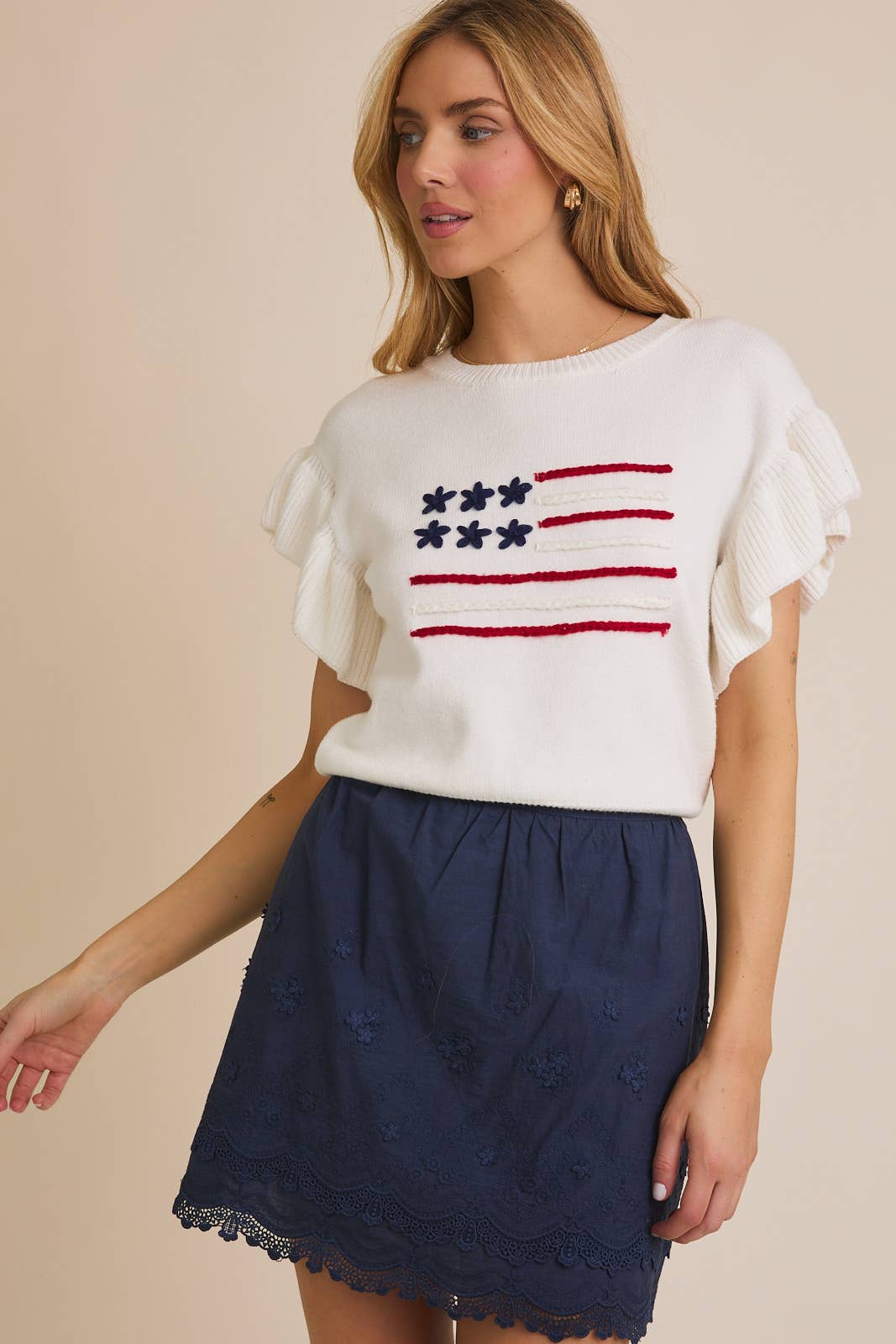 Show your stars and stripes spirit with our fun USA Flag Sweater! This playful knit feature adorable ruffle sleeves that add a bouncy, cheerful touch to your patriotic look. The short-sleeve design keeps you comfortable while you're celebrating, whether you're watching fireworks, hosting a backyard BBQ, or just feeling extra American today. Pairs perfectly with denim, navy skirt or red shorts.