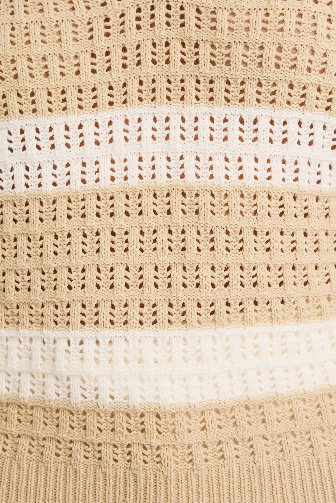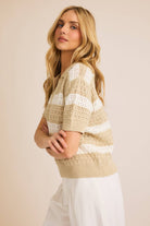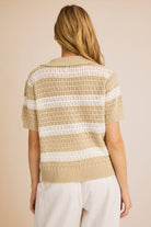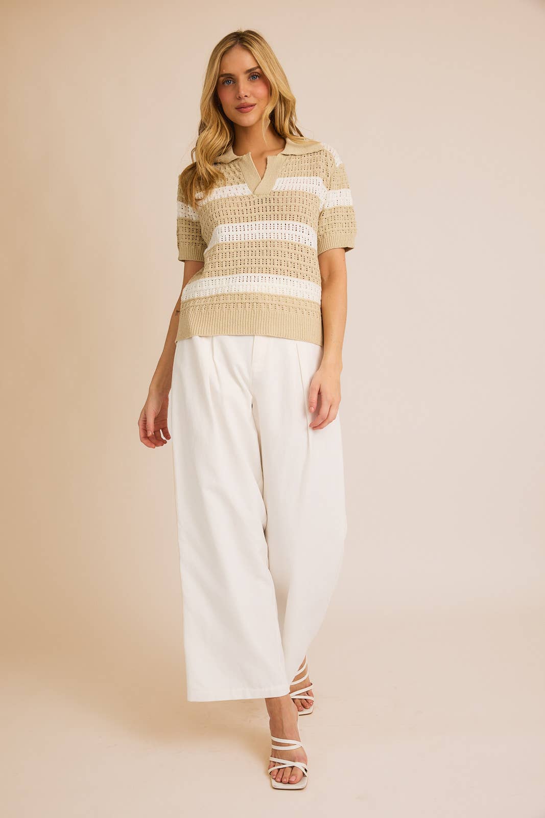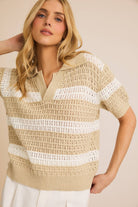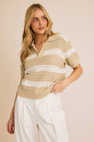 Indulge in the coastal chic style with our Coastal Collar Knit Top. Featuring a timeless stripe pattern and a sophisticated collar, this luxurious top will elevate your wardrobe. With its short sleeves, it's perfect for warmer days and effortlessly exudes elegance. Embrace the seaside vibes with this exclusive top.