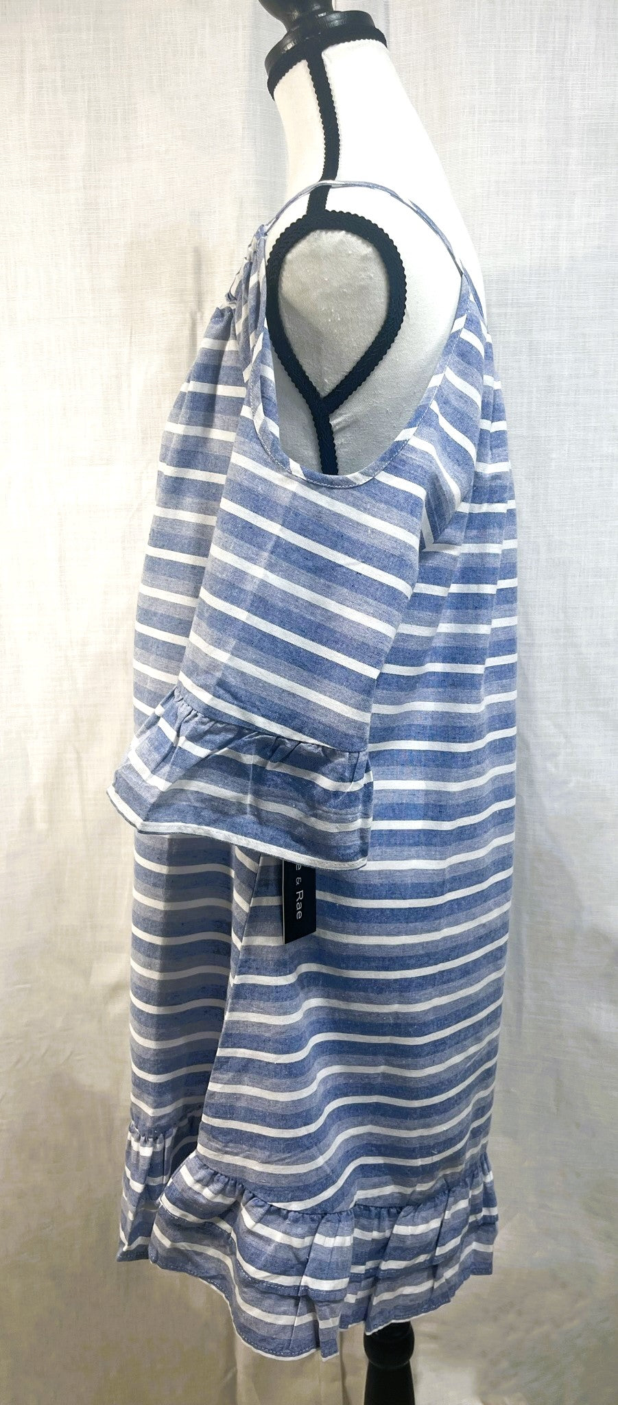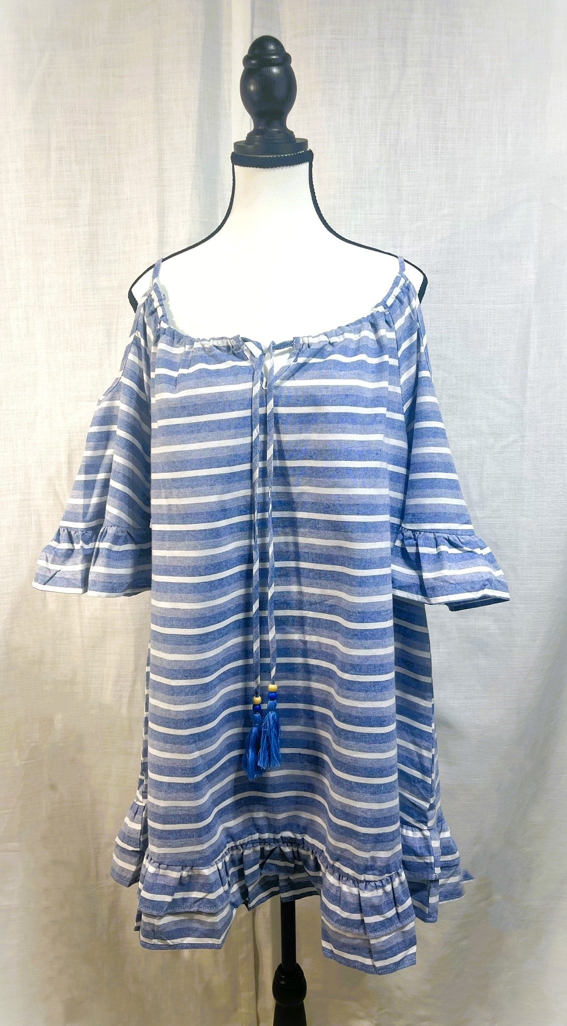 Nautical vibes, this shirt gives beach, sand and boat vibes all around. This shirt has a blue and white stripe design with an open shoulder but still gives you a ruffle sleeve. There is ruffle details at the bottom of the shirt for a flowy, relaxing shirt.