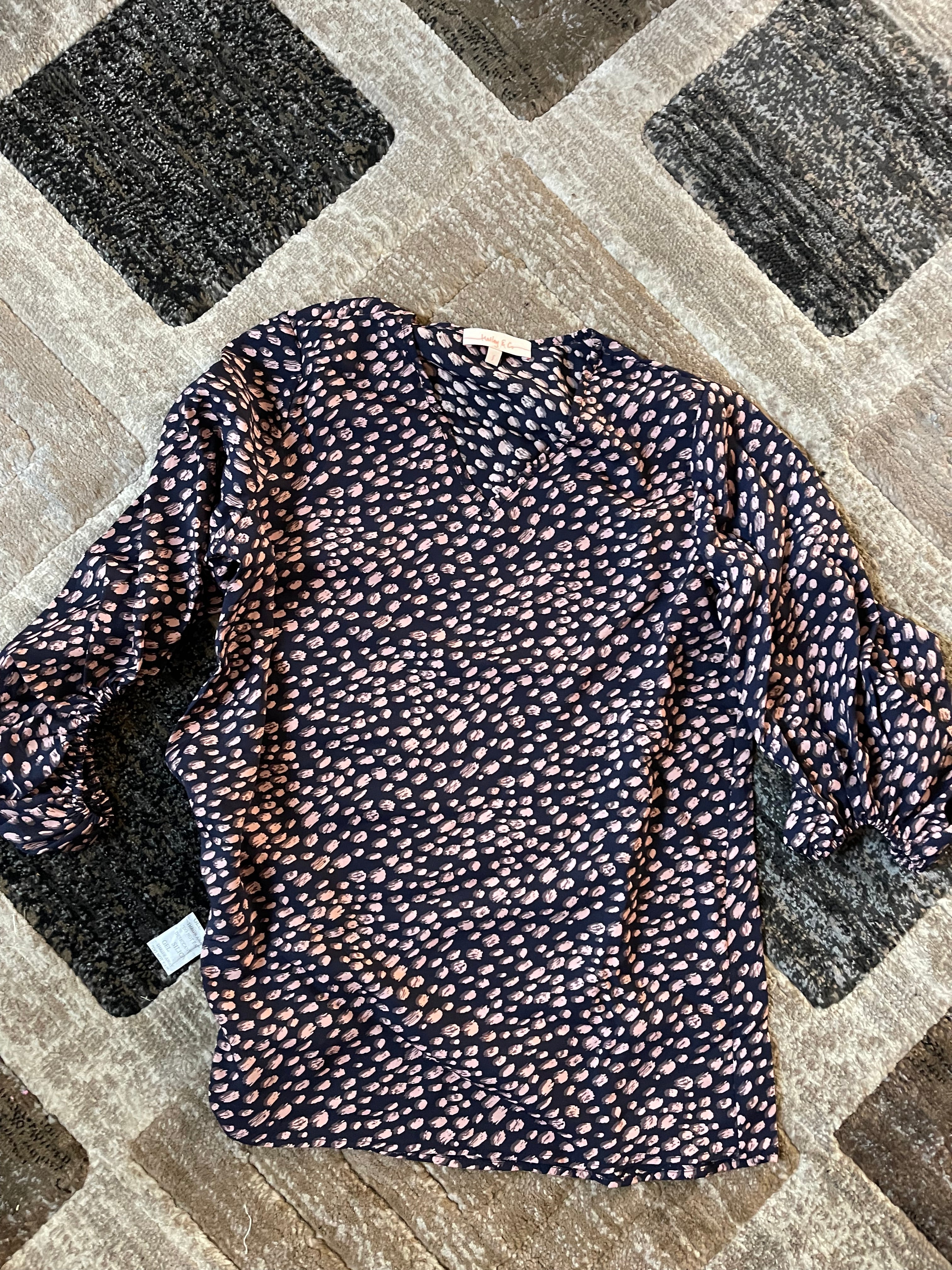 Petal dot pattern blouse has balloon sleeves that provide a flowy feel to your outfit. This is one of our go-to tops for the fall season!