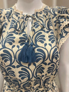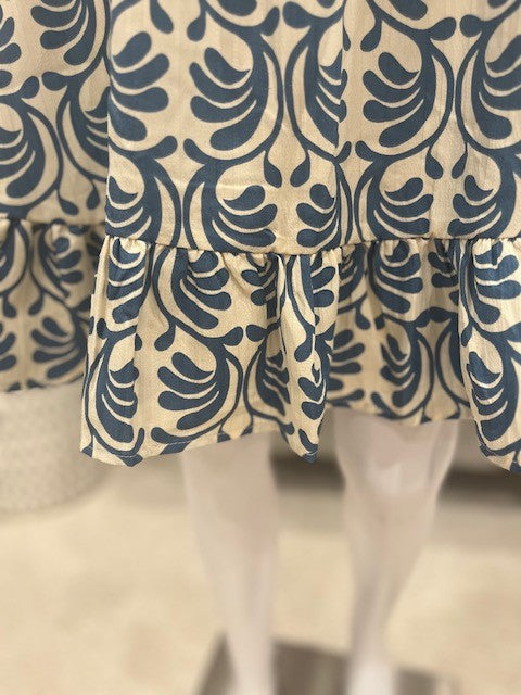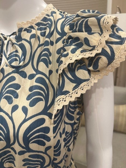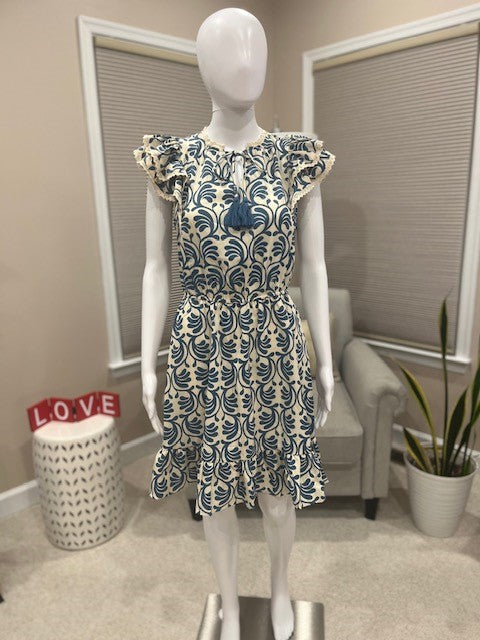 Classic, elegant, stunning dress has arrived for the spring season. This dress will have heads turning. Beautiful scroll pattern dress cinches at the waist, ruffle sleeves and tie neckline and finishes with beautiful lace detail hems.