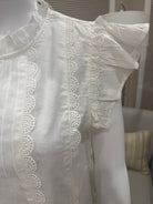 Details, details, details. This shirt does not skip out on the details, from ruffle sleeves to a ruffle neckline, to beautiful stitching patterns throughout, this top is classic and beautiful for spring/summer.