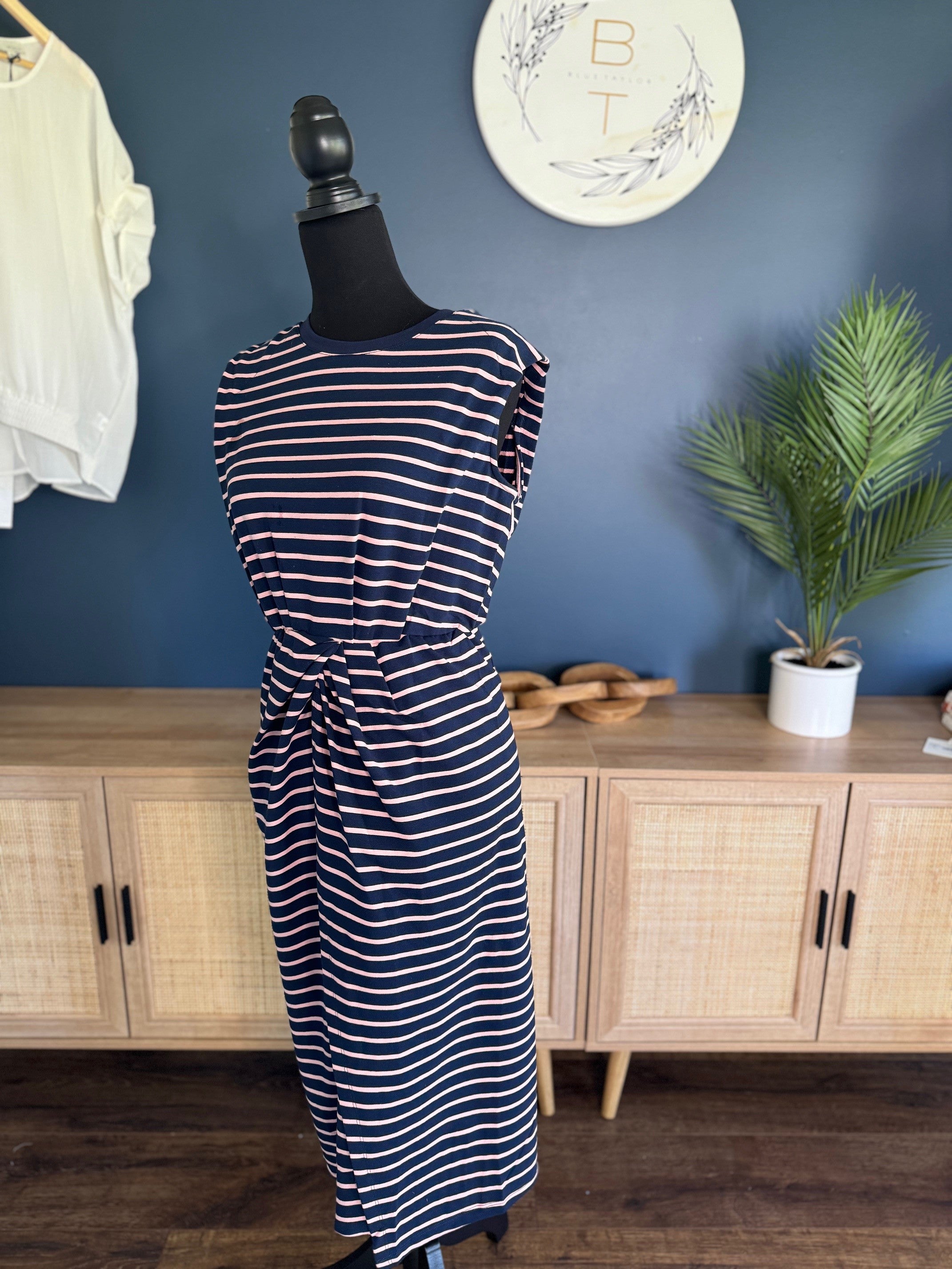 Indulge in timeless elegance with our Coastal Striped Twisted Knot Dress. With a crew neckline, cap sleeves, and a shin-length hem, this classic dress exudes a coastal charm perfect for the summer season. Embrace a sophisticated and coastal style with this must-have addition to your wardrobe.